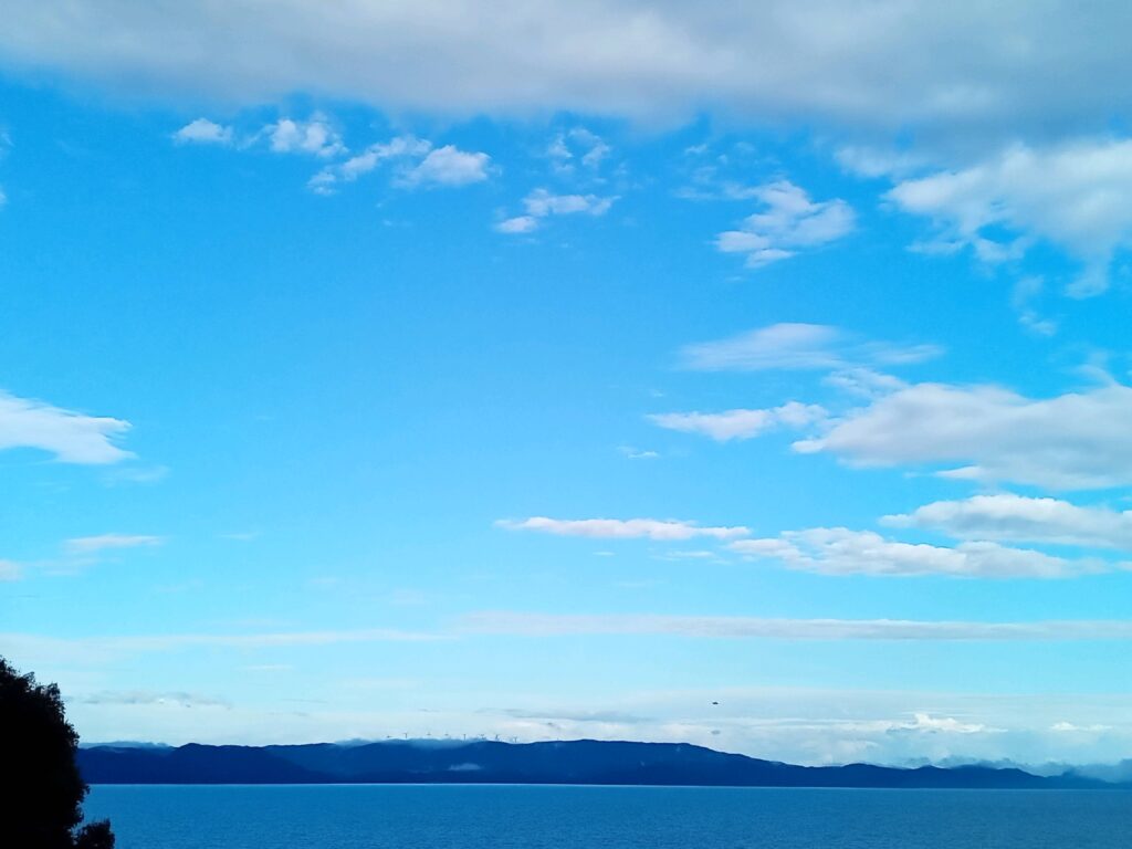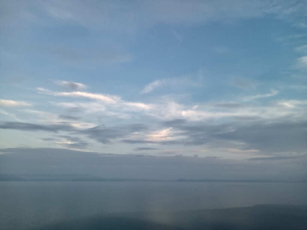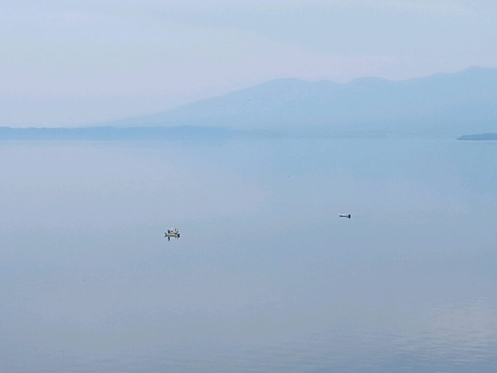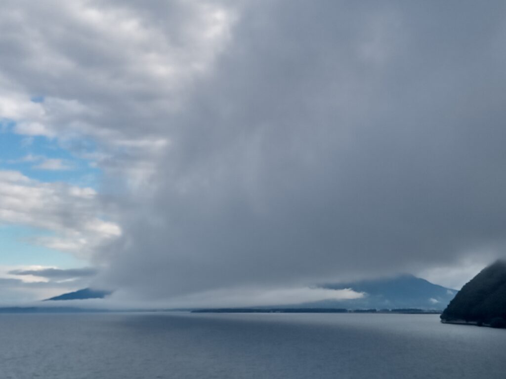 今日の最高気温は31度、無風状態で湿度は100と、何をするでも無く、首周りから汗が出て来きて、現在お昼前27度を示しています。 全国の予報では猛暑の35度以上の所もある様で、それらの場所から見たら、羨ましと思われてしまいますが・・・。 久々に一日中、青空が広がった昨日とは違い、薄い雲が上空を覆い、霞がかかった様な景色で、より一層暑さを感じます。 湖を常に目にしているせいか、喉の渇きを忘れてしまいがちですが、細目に水分補給をしなければいけませんね! 皆様も気を付けて下さい。 こんな蒸し暑い日ですので、出掛ける事無く過ごそうかと思います。 下の右側写真2枚は、今日19日午前4時45分の磐梯山方面と、マンション正面西の空、左端はちょっと分かり辛いですが午前8時ごろから目にしていた地元で漁をする舟三艘、午前10時過ぎの写真です。
