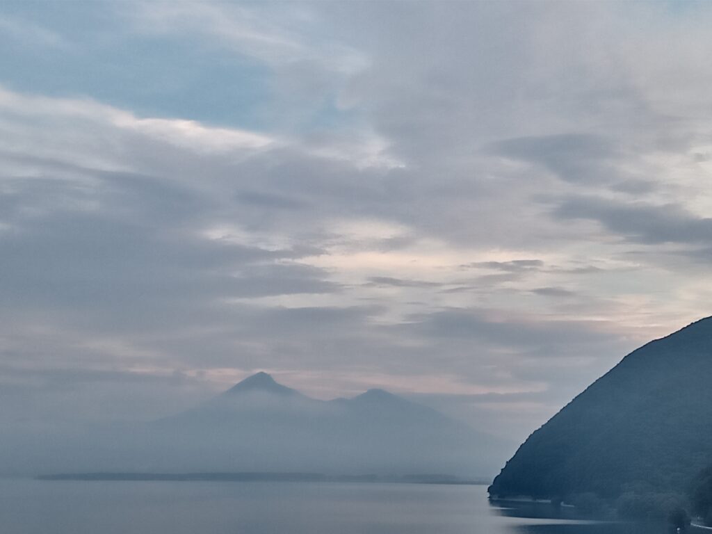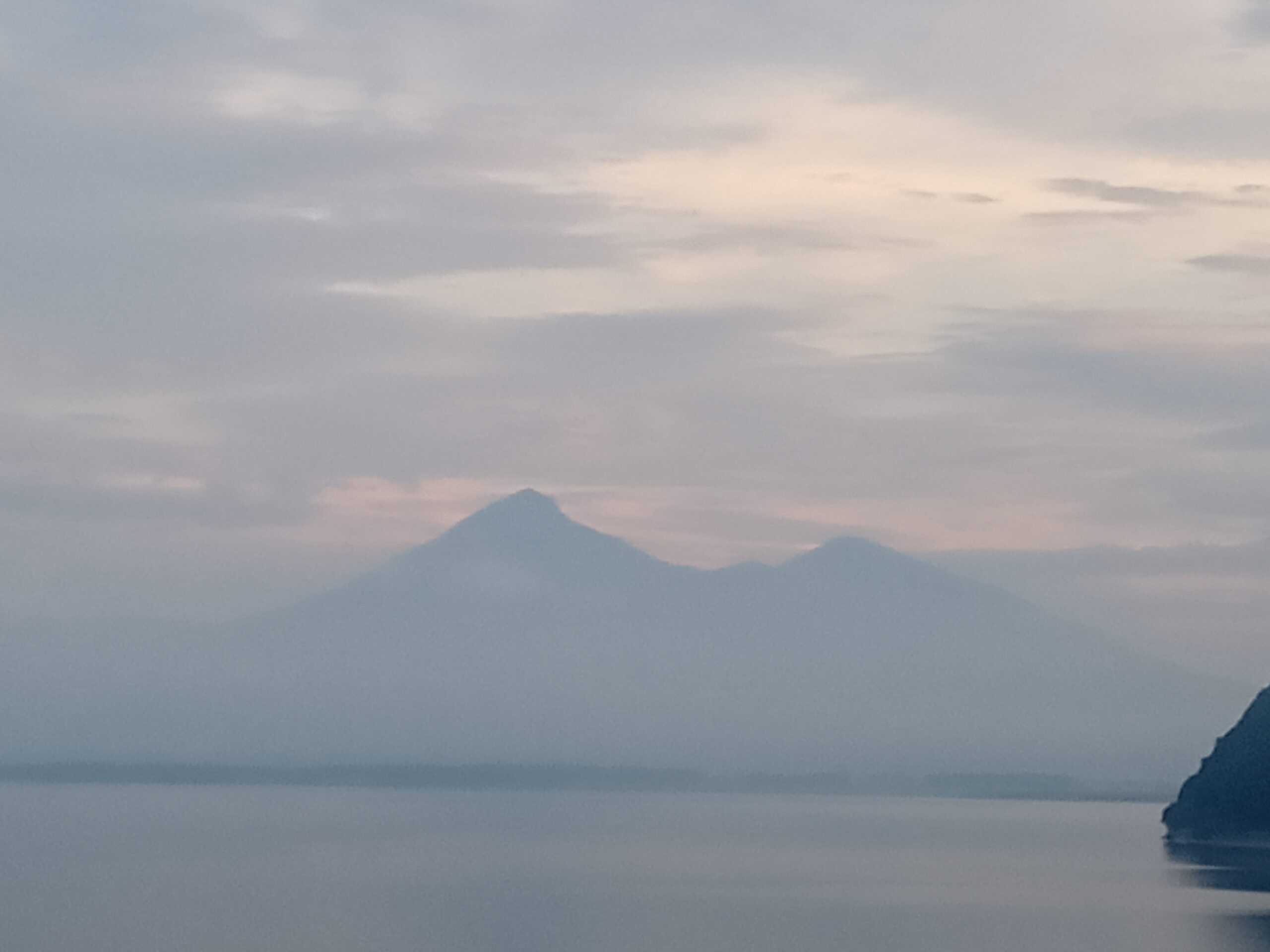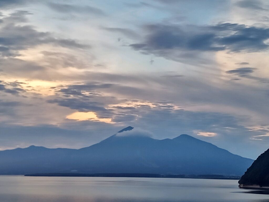 上の写真は、早朝4時45分の僅かな朝焼けに染まった雲と磐梯山。