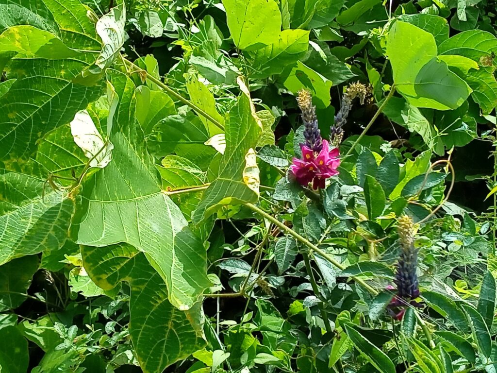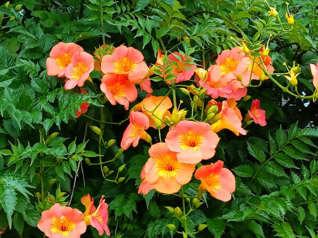 もう直ぐ7月も終わりですが、夏空同様花たちも変わって来ました。 真夏の色を濃く赤やオレンジの花が目立つ様になりました。 白い色が印象的な「山ユリ」や、少し黄色みかかった「カンゾウ」は、県道沿いでは少なくなり、オレンジの濃い「鬼百合」や庭先に数多く見られる夏を代表する「ノウゼンカズラ」と、生命力が強く秋の七草の一つ「葛」(クズ)の紫の花が見られる様になりました。 特に「クズ」はこれから盛りを迎えます。 車道脇には、周りの木々をつるで覆ってしまい、雑草の中でも多く見られ、近年特に増え、鉄道沿いなどでは駆除するのに大変な様です。 そんな「クズ」ですが根に大量のデンプンを含み、葛粉が採れ和菓子に良く使用されています。 根は薬用として使用され、解熱・咳止め・風邪等に効き、薬局で見かける「葛根」(かつこん)です。 下の写真は真夏を代表する「ノウゼンカズラ」と、後の二枚は葉が大きく紫の花がちょっと見にくい「葛」の花です。