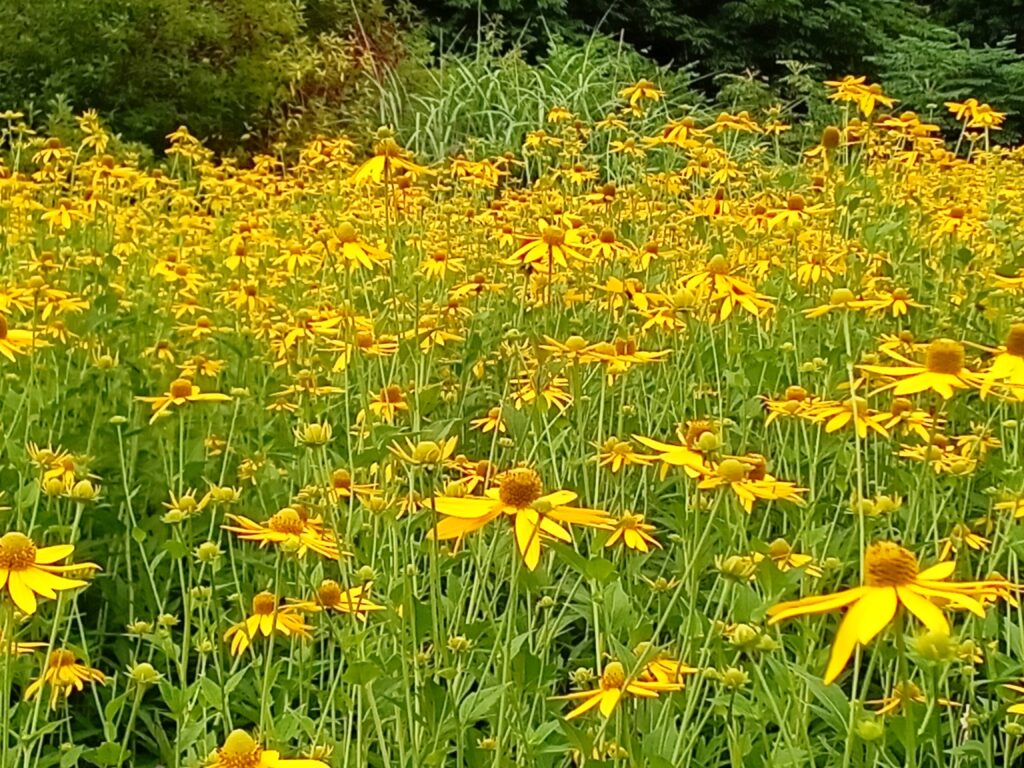 中々涼しくなりませんね! 話は全く変わってしまいますが、暑い夏に似合う花は、先日湖南の名所「風の高原布引山」の風車の下に広がる「ヒマワリ」ですが、つい最近まで道路脇や空き地一面に咲いていた黄色い花たちもそうです。 この付近では見かける事が少なくなりましたが、少し標高の高い場所に行くと目に入って来ます。 これらの多くが「オオハンゴンソウ」で最初の写真の黄色い花です。 間近で花の姿を見た方は少ないと思いますが、外来種でキク科に属し、日本古来の品種を殺してしまう、駆除対策の一つに数えられています。 辺り一面を黄色くする様は見事です。 西洋タンポポや此れから本番を向かえる月見草等も背が高くなり黄色です。 当然「虫」が一番好きな色で次に白、その理由として「黄」と「白」の植物が日本では60%程を占め、明るい色に寄って来るからだそうです。 逆に「黒」「グレー」「ブラウン」「緑」等地味な色で、これらは花や果実等の虫たちのエサに似ていない為、またこれらの色は紫外線を反射しにくい色のため、虫たちを寄せる事が少ないからと言われています。 しかし中にはこれからの季節、秋に近づくと「スズメバチ」が活性化しますが、「スズメバチ」は黒い色に反応し、攻撃してきますので、散歩やハイキングの時は注意して下さい。 下の写真は左が畑の様な「オオハンゴンソウ」の群れと、最近は少なくなった「セイタカアワダチソウ」名前からも分かる様に背が高く外来種です。 右が此れから本番を向かえ黄色く色づく「ブタクサ」です。 どちらも駆除対策に入っています。 「ブタクサ」に至っては花粉症でも知られています。 日本全土に広がったこの花たちは、地下茎や土壌シードバックで繁殖し、単純に刈り取るだけでは根絶は難しく、根ごと引き抜くき、根を焼却処分する必要があります。 当然日にちも人件費もかかり、どの自治体も苦戦しています。 外来種が沢山入って来ていますが、駆除対策が追い付かないのが現状の様です。 綺麗だけでは済まないですね。 山登りをされる方はご存知かと思いますが、国立公園内の山に登る時には、出入りする場所で靴の底を綺麗にして、種を持ち込まないようにします。 この猪苗代湖も磐梯朝日国立公園ですので、これらの花がこれ以上増えないように、みんなで気を付けましょう。 よろしくお願い致します。