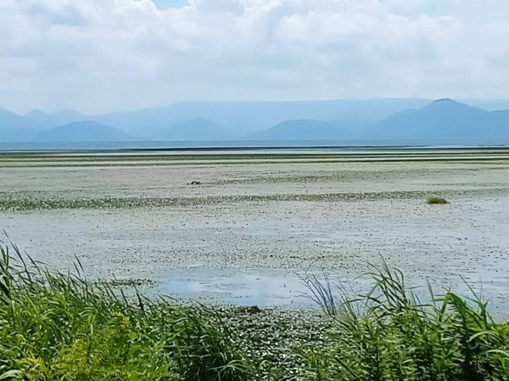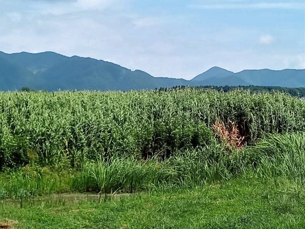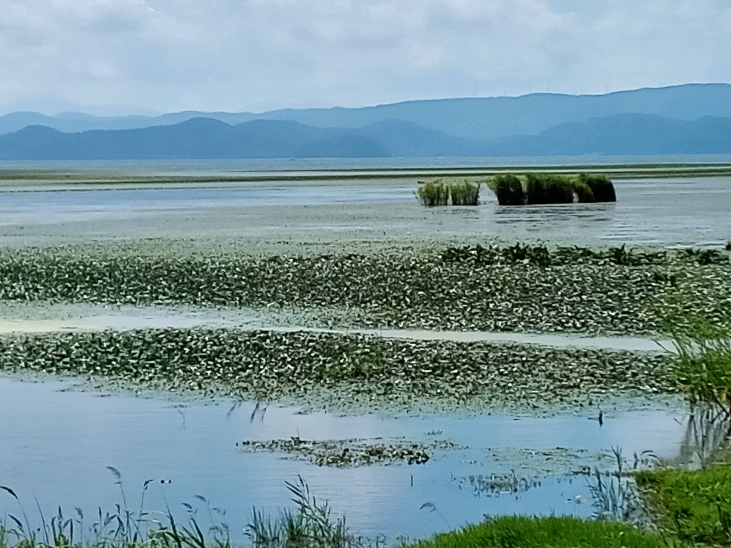 前回は外来種で駆除対策に入っている黄色い花たちを紹介しましたが、今回は陸では無く、湖の中の厄介な物「ヒシ」を取り上げます。 葉が水面に浮く浮葉植物で、繁殖が強く腐ると水中にリンや窒素を出し、水質の悪化を促しる植物です。 マンション付近では余り見かけませんが、マンションから湖を正面に見て、右側に緑濃く延びた林が見えますが、手前は猪苗代町を流れ河原を赤く染めた「長瀬川」の河口に辺り、冬のしぶき氷やキャンプ地としても知られる天神浜が、この林の裏になります。 そして「ヒシ」がある場所はこの天神浜より更に奥にあり、白鳥が浜に多く生息しています。 湖の中で最も浅く波が立ちにくい場所です。 白鳥が浜から野口英世記念館までのサイクリングコースでは、7月から8月の最も暑い季節に花が綺麗に咲いている時期に、「ヒシ」刈りが行われます。 秋を向かえて種になってしまうと水中に落ちてしまい増えてしまうのを防ぐためです。 深さのある場所では水草刈り取り専用船を使用出来ますが、浅瀬は船が入る事が出来ないため、人の手で刈り取るしか方法は無く、ボランティアを集い、真夏の一番暑い時に熱中症と闘いながらの作業です。 今年の作業は既に終わった日も有りますが、毎週金曜日の午前9時から11時ごろまで、9月中旬まで行われる様です。 また初秋から初冬にかけて、正しくこれから「ヨシ」刈りや水草回収作業を見る事が出来ます。 「ヨシ」は水中の「ヒシ」とは違い、逆に水を綺麗にする働きがあります。 その一つが水中のリンや窒素を吸い取る働きです。 この事がとても大きいですが、他に魚や鳥の棲家になっています。 只「ヨシ」も放っておくと腐って水質悪化に繋がりますので、毎年刈り取りより強い「ヨシ」を育てる為に刈り取りが行われています。 今年の「ヨシ」刈は10月下旬ごろ予定されていて、こちらもボランティアの人の手で行われます。