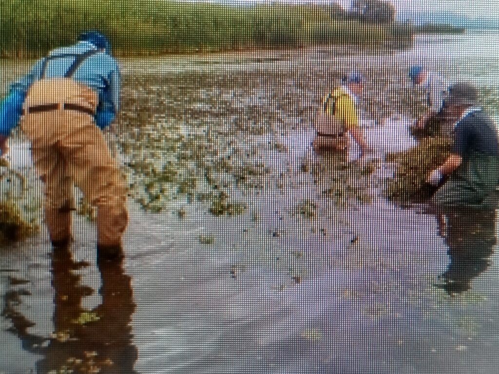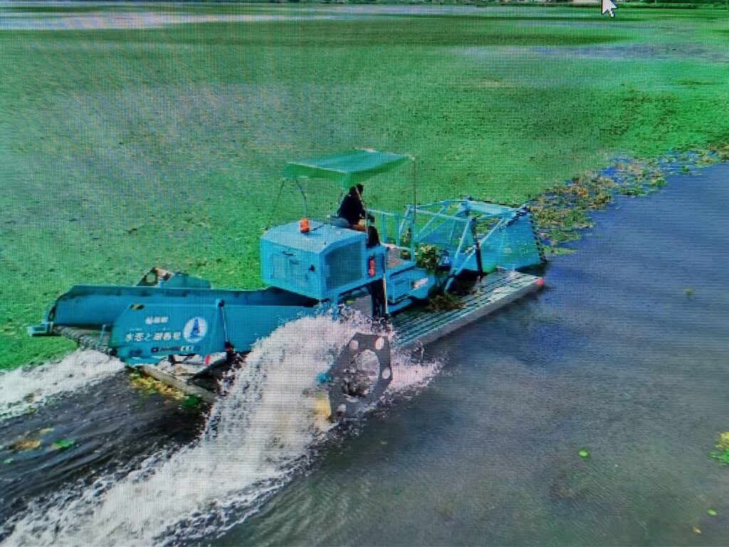 参考までに猪苗代水環境センターで黄色い花「アサザ」の写真を撮らせて頂いた様に、「ヒシ」と「ヨシ」刈りの作業と専用の機械船の写真も撮らせて頂きましたので載せておきます。(写真を携帯カメラで撮りましたので画像に乱れが有りますので、ご了承下さい)