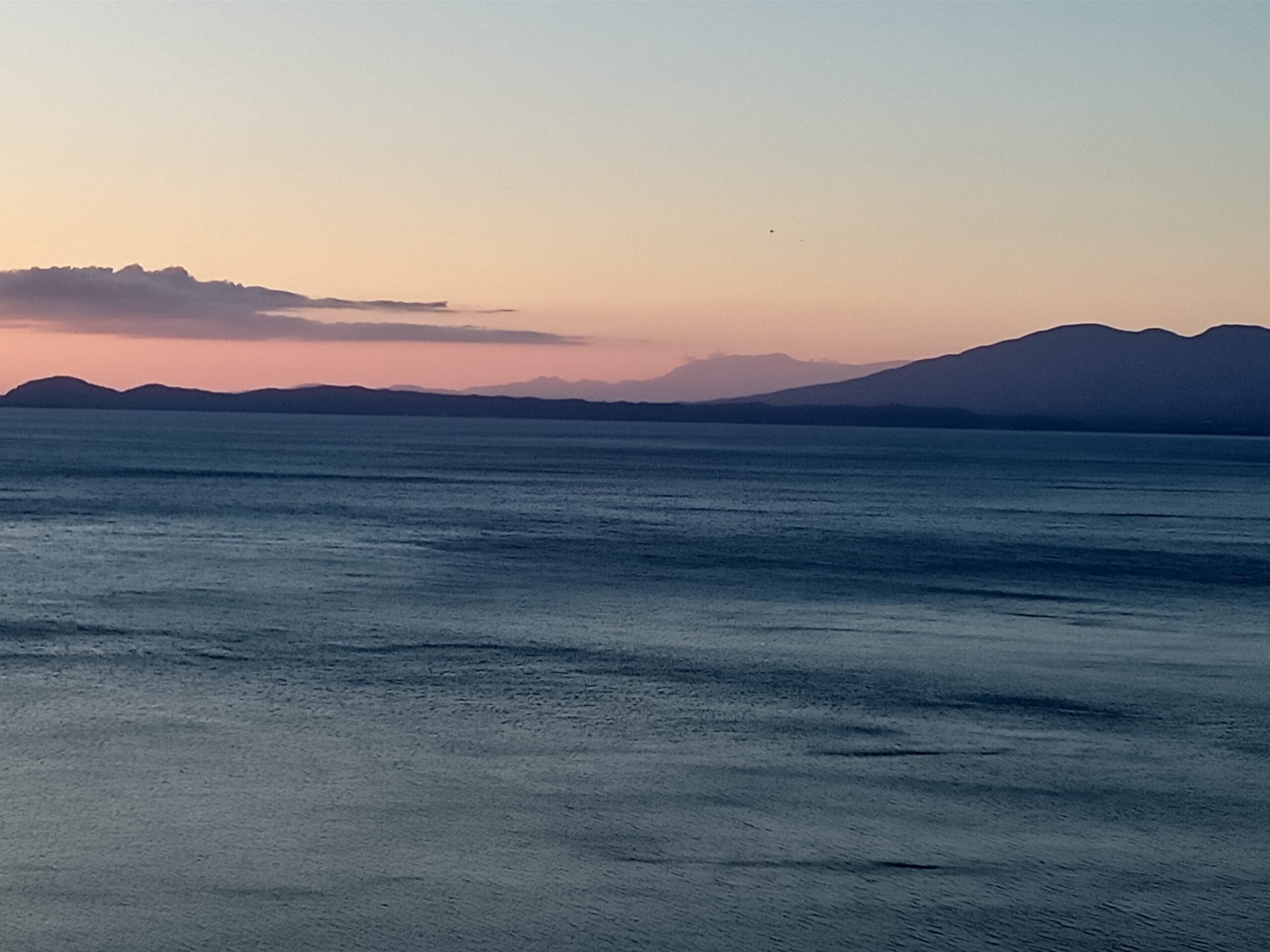 写真は今日夕方5時57分、遠くに夕日に染まる「飯豊山」が見えています。