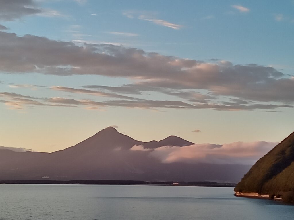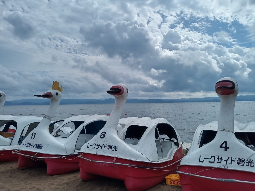上の写真の風景と最後の写真の風景は、今日現在の写真ですが、この夕陽と夕暮れの磐梯山だけは何百年と変わらない風景と思います。 大きな船の行き来は、もう見る事が出来ませんが、可愛らしい舟は長浜の遊覧船と志田浜の白鳥のボートで楽しんで下さい!