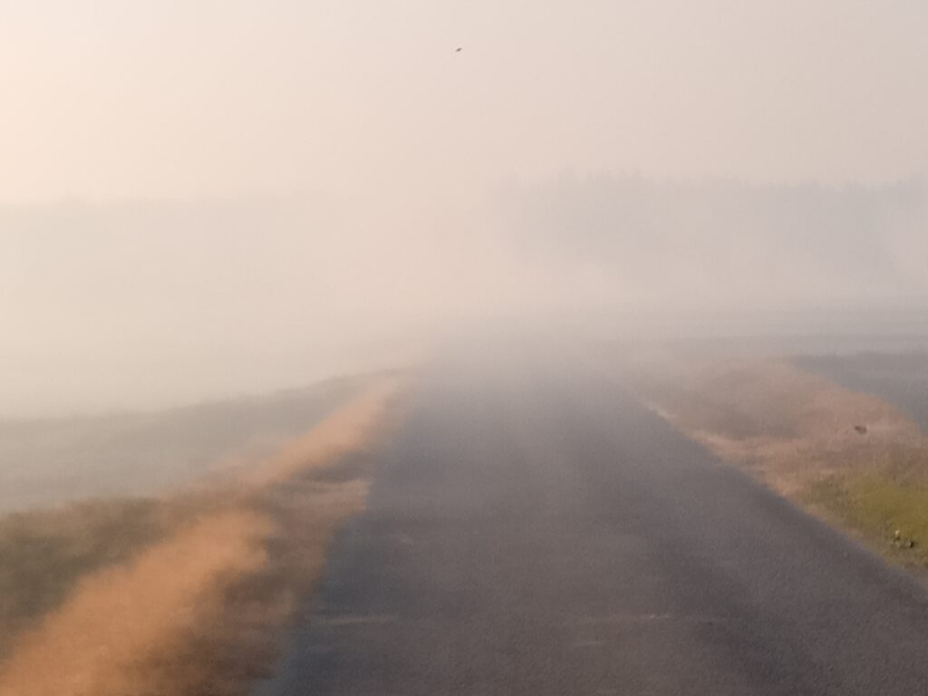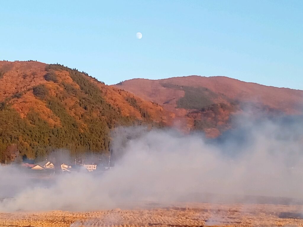 左は風向きが変わり煙に覆われた道路と、中央が煙を抜けた先の野焼きが行われていた田圃に、右が煙が徐々に山の麓まで達した姿で、良く見て頂くと写真の真ん中、山の上に今日満月を迎えた月が見てとれます。 これらの撮影は13日(水)午後3時45分ごろです。