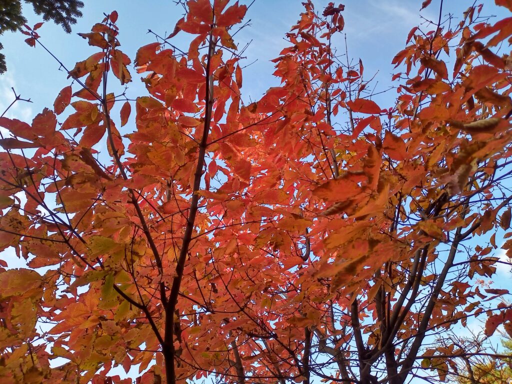 下の3枚の紅葉は、14日(木)のマンション内で撮った写真です。 左が正面玄関の「ナナカマド」で、今月7日のお知らせの写真と同じ場所です。 撮影時間と光の具合で、ちょっと全体的に赤いですが、まだ沢山の実がついていますが、葉はだいぶ散りました。 後ろに写っている葉が、7日段階ではまだ黄色みを帯びていましたが、橙色にかわりました。 その葉が中央の紅葉の木で「メグスリノキ」です。 カエデ属の落葉高木で、カエデの仲間としては珍しく、3枚の小葉で1枚の葉を形成しています。 漢字で「目薬の木」と書きます。 目の病気に効能があると言われ、この名前がつきました。 山地で育ち、北限は宮城県と山形県の南部で、東北だけでなく全体にも少ない木です。 貴重な1本ですが、もう少し時間をかけて探して見たいと思っています。 右の写真は、マンション裏側テニスコートの一段上の広場の先にあり、一戸建ての家の前のカエデの木で、真下に入り下から見上げて撮りました。 写真で紅葉を楽しんで頂けたら嬉しいです!