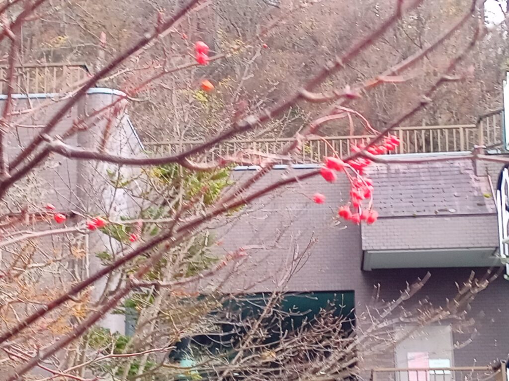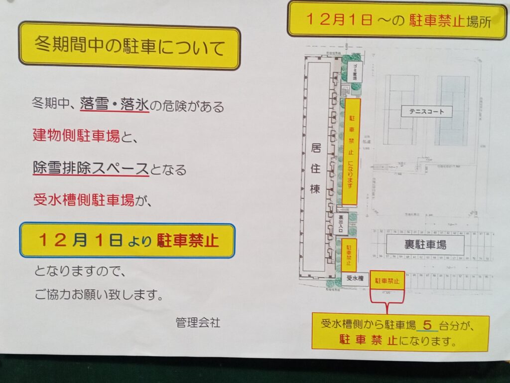明日12月01日より駐車禁止の場所が例年通り行われます。(下の写真参照) また居住者の方達は既にご存知と思いますが、女子サウナが故障し使用できません。 今後の修理過程等は事務所へ問い合わせ下さい。 日記を更新しました。 今回は私の大好きな場所の写真と、たわいもない話で綴っていますが、日記を書いている時には真白な景色が青空へと変わり、写真を撮り部屋に戻り、お知らせを書いている間に全く何も見えない真白な世界へと変わってしまいました。 気温は低く2度です。 雪道より凍った道の方が危ないですので気を付けて下さい! 下の写真は事務所からのお知らせ二つと、今日の正面玄関の「ナナカマド」です。 最初の写真はお昼時に見えた僅かな青空です。
