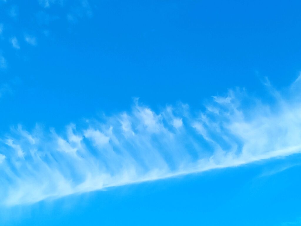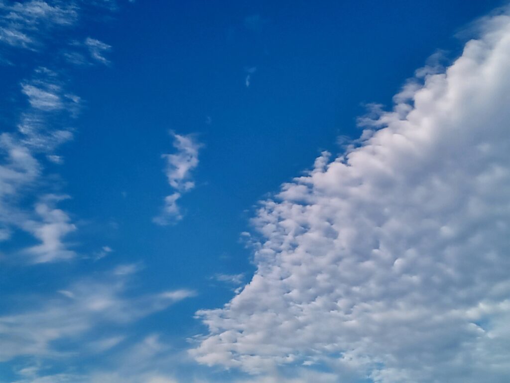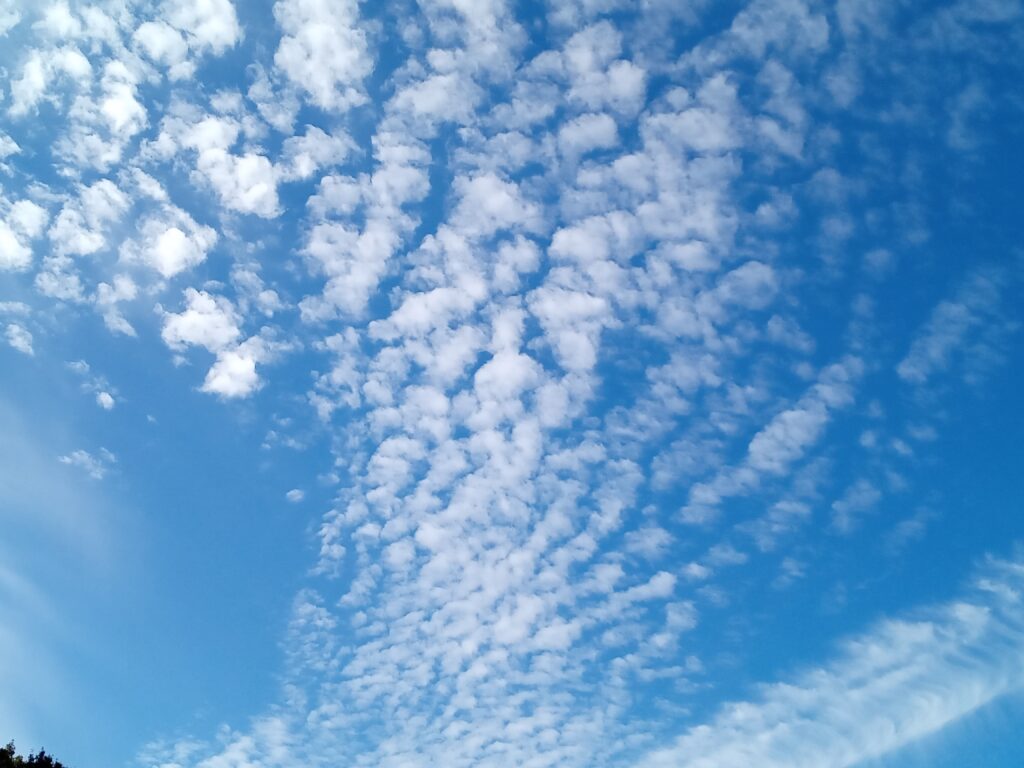 余りの空模様に青空が恋しくなり、暑かった長い夏が過ぎて例年ですと、天高くの秋空が広がる10月・11月の空を思い出すと、今年は少なく感じ、撮って有った写真を振り返って見ても、日数は片手で数えられる程でした。 皆さんもご存知の秋の雲の代表格「うろこ雲」や「すじ雲」等が有りますが、他にも魚の名前が付いた「イワシ雲」「さば雲」更には「ひつじ雲」と、専門家じゃないと分からない名前が沢山有りすぎて、困ってしまいますが、どれも低気圧や秋雨前線が近づいている時に現れ、天気が下り坂で雨が降る前兆と云われています。 そんな中で私が撮った片手で数えられる日の雲6枚を紹介します。