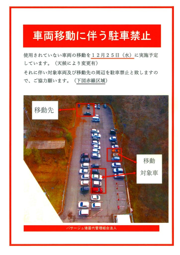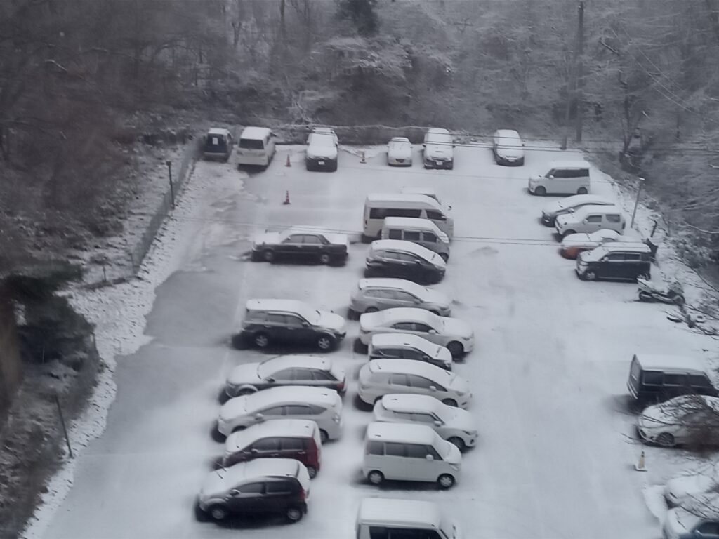 もう直ぐ冬休みを迎え、家族でまた友達と楽しい休日を、ここ湖南町当マンションで予定を立てている方も多いかと思います。 この夏この地で過ごされた方も大変多く、当然冬も雪景色を観に、スキー等ウィンタースポーツをと考えて訪れる方も多い事を予想して、冬場雪の影響で何かと狭くなる駐車スペースを、少しでも多く確保する為に、ここ数年以上使用されていない車両をマンション裏手の駐車場の奥に移動させます。 この作業に伴い工事車両を考慮し、駐車禁止位置を決めました。 日時や場所は下のパンフレットをご覧下さい! 隣の写真は今日午前10時の駐車場の様子です。 薄らと白くなりました。