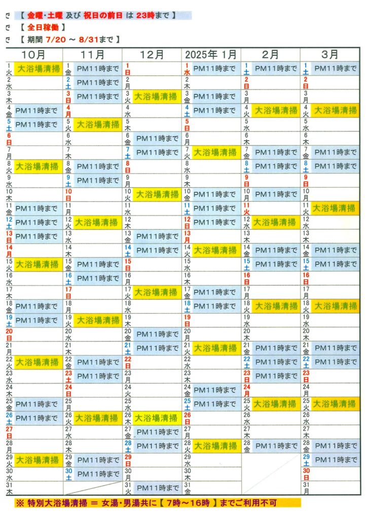 皆さんは、掲示板に貼ってある「温泉・プールカレンダー」をご覧になっていますか? 常日頃、見ていらしゃる方は、お気づきかと思いますが、浴槽清掃日が12月の4週目に当たる日は、火曜日では無く26日木曜日になっています。 私自身、見ている様で見ていない事に気が付きました。 掲示板に目を通す事の大事さをつくづく実感しています。 下の右側が一年を通したカレンダーで、此れからの必要な部分だけ(2025年3月)を載せています。