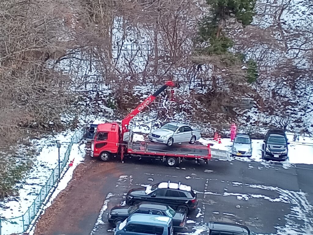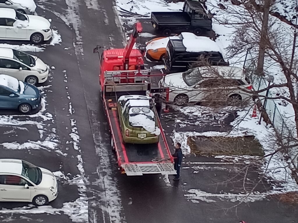先日22日のお知らせにて「車両移動に伴う駐車禁止」のお願いをしていましたが、今日25日(水)午後2時15分に、無事終了しましたので、ご報告致します。 昨日まで強い風と、降ると云う表現より、飛ばされて来ると云った雪がぴったりの悪い天気が続いていましたが、今日は早朝はー3度と冷え込みましたが、日中は風も弱く4度まで上がり、駐車場や前を通る県道9号線の路面も乾いて来ました。 午後1時過ぎに車両移動用のレッカー車が到着し、約一時間程で二台の車を、マンション裏手の左側に移動させ、その後、管理事務所がオートバイと焼却炉を移動させて、全部の作業を終えました。 普段より駐車カ所が少なく、ご不便をおかけしましたが、ご協力ありがとうございました。 下の写真3枚は作業の様子を載せました。