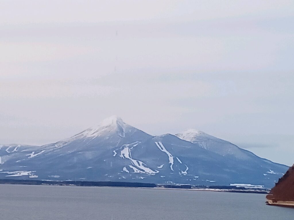 下の写真左側は、駐車場左奥に並んだ移動車両と、中央が午後三時全ての行程が終わった駐車場と、右側が午前中は見えず、午後三時半姿を見せた磐梯山です。