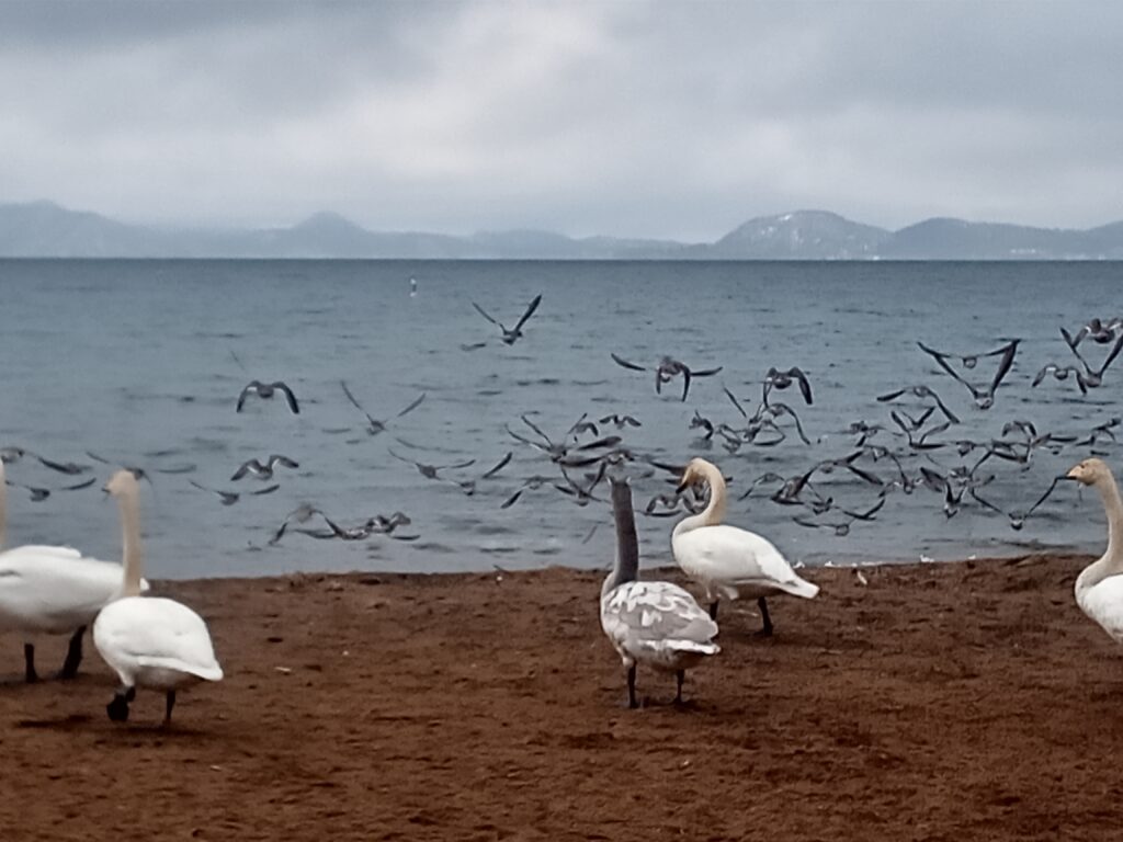 上の最初の写真は六日の午前9時に撮った真白な「飯豊山」です。 下の写真左側は朝7時朝焼けの磐梯山と、中央が同じ六日の9時、青空の下の磐梯山。 右側が昨日七日の志田浜の白鳥と、足音に驚いて飛び立ったオナガカモで午後1時です。