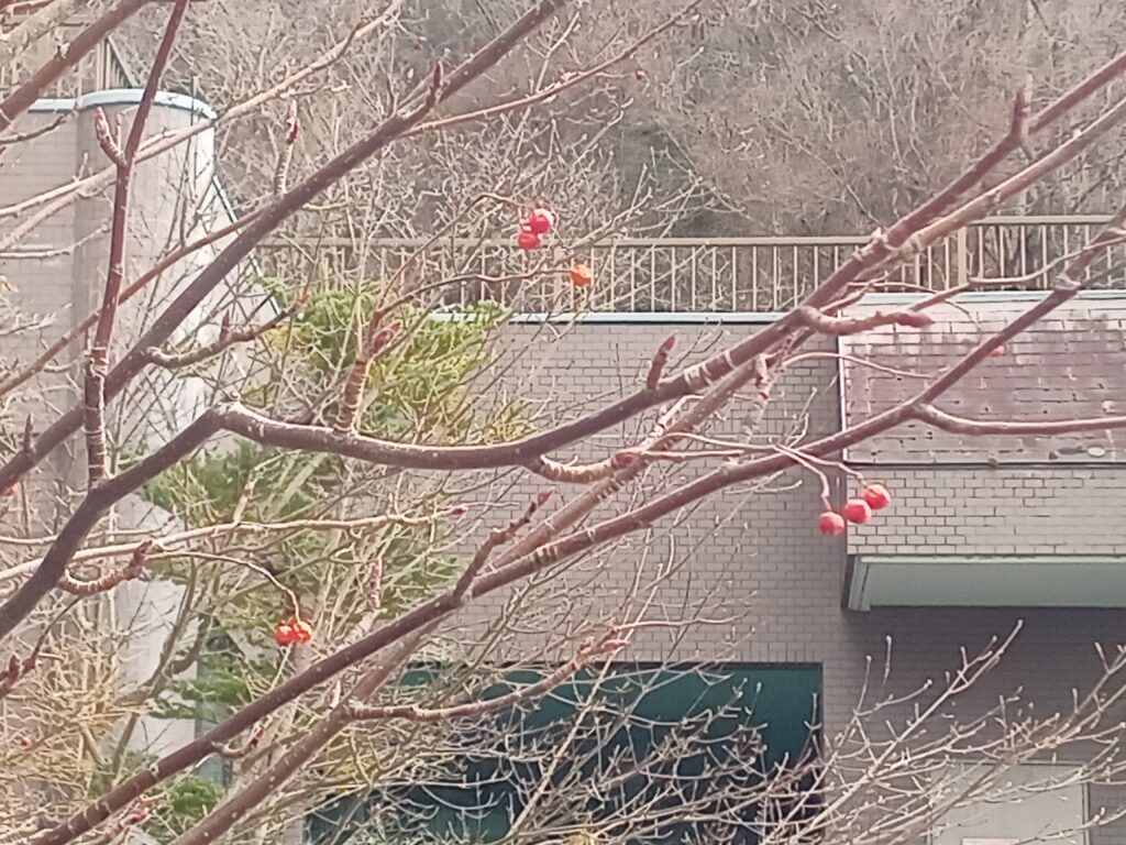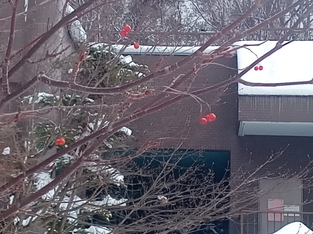 昨日朝7時の路線バスで出掛け、今日もその予定の為、現在5時を少し回った所ですが、この後バタバタと4~5日忙しい事もあり、いま日記を書いています。 今週最初の三日間は良く晴れましたが、後の三日間は低い雲が立ち込め、気温がマイナスからプラスに変わったせいか、霧に覆われて雪化粧をした山々が良く見えませんでした。 紅葉が終わり全ての葉が落ち、真赤な実が残った正面玄関前の「ナナカマドの実」をほぼ毎日観察し写真に修めていました。 新しい年を迎えてもその姿は健在で、強い此処特有の回るような風にも、8日から降り出した雪にも負けずに残っていた「赤い実」が、とうとう13日の日の強い風に飛ばされて枝から落ちた実さえ見つける事が出来ませんでした。 深夜から午前中は雪が降り、午後から一気に青空が広がるそんな一週間が続いた二週間前の出来事でした。 何時かは日記に載せたいと思っていました。 まだ薄暗い朝5時の今思い出し、写真を見ながら振り返り書いています。 真赤な実だけを取り上げてしまいましたが、花は白くフワフワとしています。 花言葉は「慎重」「賢明」「私はあなたを見守る」。 名前の由来は「かまどに七度くべても燃え尽きない程硬く強い枝を持つ」事からきています。 また街路樹にも多く植えられていますが、花言葉から交通事故防止の願いを込められていますとの事です。 花は5月中旬ごろ咲きますのでその時に紹介しますね! 最初にも書きましたが今日もまた朝マンション前7時の路線バスで出掛けます。 何時もせわしい朝の時間、ゆっくりと朝焼けに染まる対岸の山々と、朝日に照らされる磐梯山を見る時間が有れば嬉しいのですが・・・。 下の写真左側は本格的な雪が来る前7日と、中央が枝に雪が見え小雪舞う9日、右側がよくよく探すとまだ数個の実を見つける事が出来ましたが、初冬より撮っていたアングルの実は落ちてしまった13日の写真です。