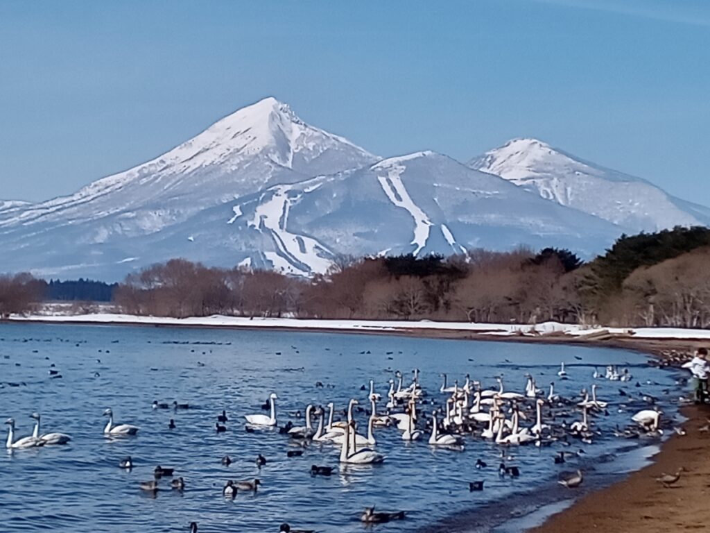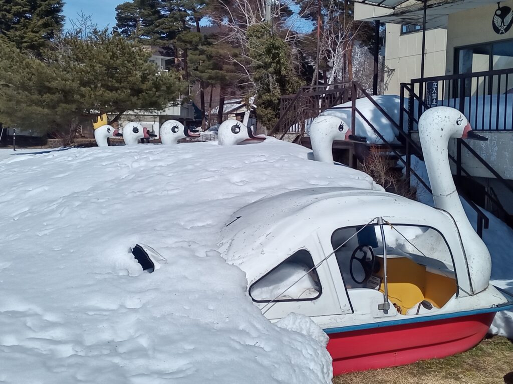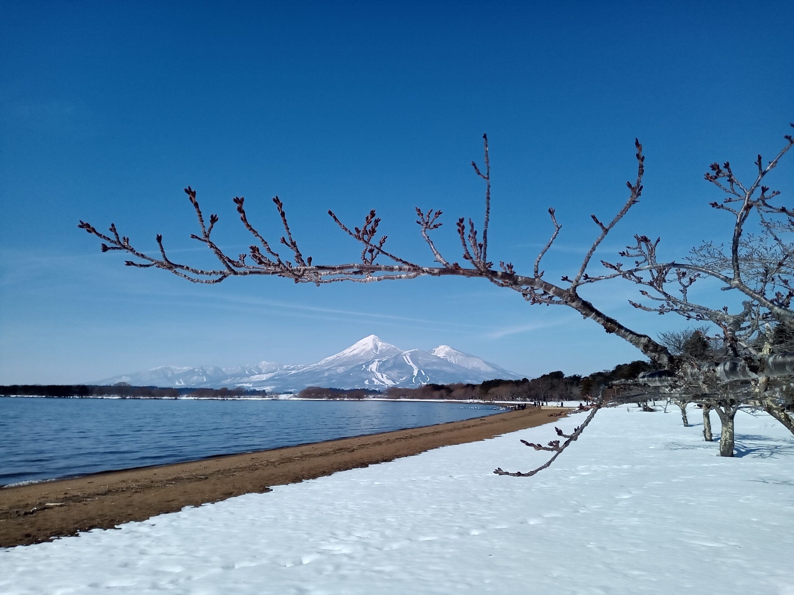 今週月曜日3日から、今日7日までの天気は、真冬へ逆戻りしたかの様な一日おきに雪が降っています。 強く長く降り続く事は有りませんが、早朝は一面薄っすらと白く積もり、お昼ごろには車道は溶けてしまいますが、それでも今日は朝には上がっていた雪が、お昼前11時半ごろから強い風と共に、視界を閉ざし粉雪が舞い始めました。 3月になってもう一週間、前回3日には観光案内目的の周辺情報を久し振りに載せましたが、内容が日記の方が良かったかなぁ~?と思っていますが・・・。 今日は一日、今年初めて僅かな時間約往復で30分程、自転車に乗った時の様子をお届けします! 前日28日約三時間余り歩いた事もあり、足に疲れも感じてはいたのですが、あまりにもお天気が良く綺麗な青空と気温に誘われて、買い物もあり国道49号線志田浜のセブンまでと思い、自転車で外に出ました。 お昼正午20分ごろ、風も弱く土曜日とあって大きな車の往来も無く、側道の雪も殆ど溶け快適に進み、国道49号線との交差点上戸水門まで行きましたが・・・やはり国道は往来も多く、それよりも側道には除雪された硬い雪が高く積もっています。 歩道も道幅が分からない程です。 自転車を諦めてレストラン近くの松の木の下に置き、歩く事に決めました。 歩き始めと同時に驚きの光景が目に飛び込んで来ました。 何と何と、サウナから出て来た若者4人が、湖に入って行くのです! まぁあ~確かに水風呂と思えば良いのですが・・・。 見ている方が寒くなってしまい写真を撮るのも忘れてしまいました。 雪がまだまだ残る上戸浜公園を通り抜け、遊歩道に入ったものの、雪の表面はザラザラ中は緩く、進むのに難儀しましたが、数人の足跡もあり、一歩一歩慎重に雪の無い縁石の上を歩いたり、幅の広い側道を歩いたりと、通常の2倍近い時間をかけて進み、志田浜に着きました。 砂浜もレストラン近くまで雪がありましたが、真白な雪と湖の先に見える磐梯山はとても綺麗でした。 土曜日の良い天気、家族連れが白鳥や鴨に餌を撒いている光景が、長閑な時の流れを感じつつ、浜を後にセブンまで行きましたが、流石に猪苗代町、この二月は湖南町も驚くばかりの積雪でしたが、マンション周りや浜路・舟津方面はだいぶ溶けて、春の訪れを感じていたのですが、雪の多さに店の除雪された駐車場の高く積もった雪に、その違いの雪の降り方に驚きました。 猪苗代町に住む知り合いが、車で出掛けるのも一苦労、雪搔きで筋肉痛で身体が痛いと云っていましたが、納得のいく光景でした。 上の最初の写真は、志田浜入口からまだ蕾が硬い桜の枝を通しての磐梯山です。