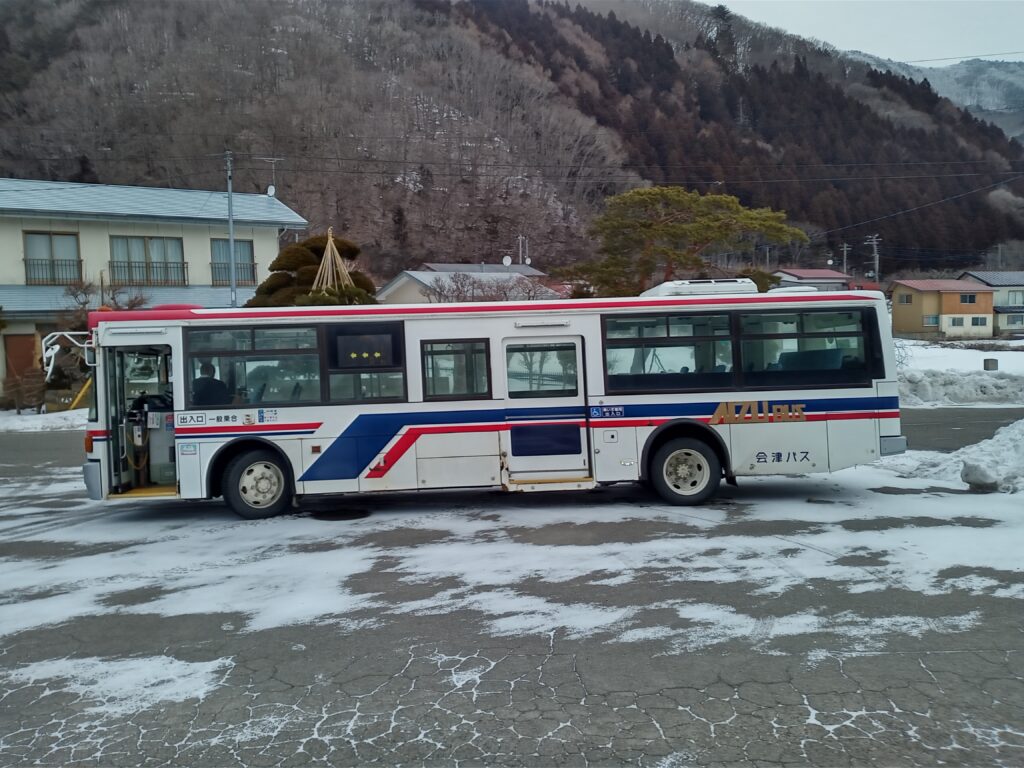 玄関そばの待合室でと思っていたので、とてもありがたかったです! 今度は泊まりで是非来ようと思う程、建物は茅葺古民家で二百七十年の伝統を秘めた温泉宿でした。 帰りのバス12時54分温泉前発のバス停までほんの数分。 外に出ると薄曇りから綺麗な青い空へと変わり、風も穏やかでバスを待つ間、寒さを感じる事はありませんでした。 帰りの乗車客は朝と同じ方達が順番に乗って来ました。 工程の約3/2を過ぎた天栄村役場から、家族連れが2組乗り、須賀川駅に予定より少し遅れの14時40分に着きました。 後は郡山駅まで戻り、買い物を済ませ電車と上戸駅発最終バス午後6時50分発勝田内行きに乗り帰って来ました。 昨日のコースと場所を確かめようとネットで地図を見ると、何と車を使うと一時間半もかからずに湯本温泉まで行くのです。 舟津の先三代から国道294号線を白河方面に進み、勢至堂峠を下り国道118号線を湯野上温泉方面に進むと羽鳥湖の先にあるのです! 1000mを超す山の上に電力風車が建ち並ぶ布引山の真裏なのです。 マンションを朝7時のバスに乗り、電車とバスを乗り継いで到着したのが11時と4時間。 車移動に慣れている方々にとっては大変な時間かも知れませんが・・・これはこれで移り行く景色を楽しみ、人との出会いもあり、ゆっくりと時の流れを味わうのも良いものですよ! 最初の上の写真は昨日午後5時45分、マンション正面対岸が久し振りに黄昏色に染まった風景です。 下の左側は今回配布されたバス無料デーのチラシで、第1回・第2回とあるので、次回があるのかぁ~?期待しています! 中央は上戸駅前で撮った日頃お世話になっている会津バス。 右側が2月には大変な大雪で運休が続いた磐越西線上戸駅に入って来た電車です。