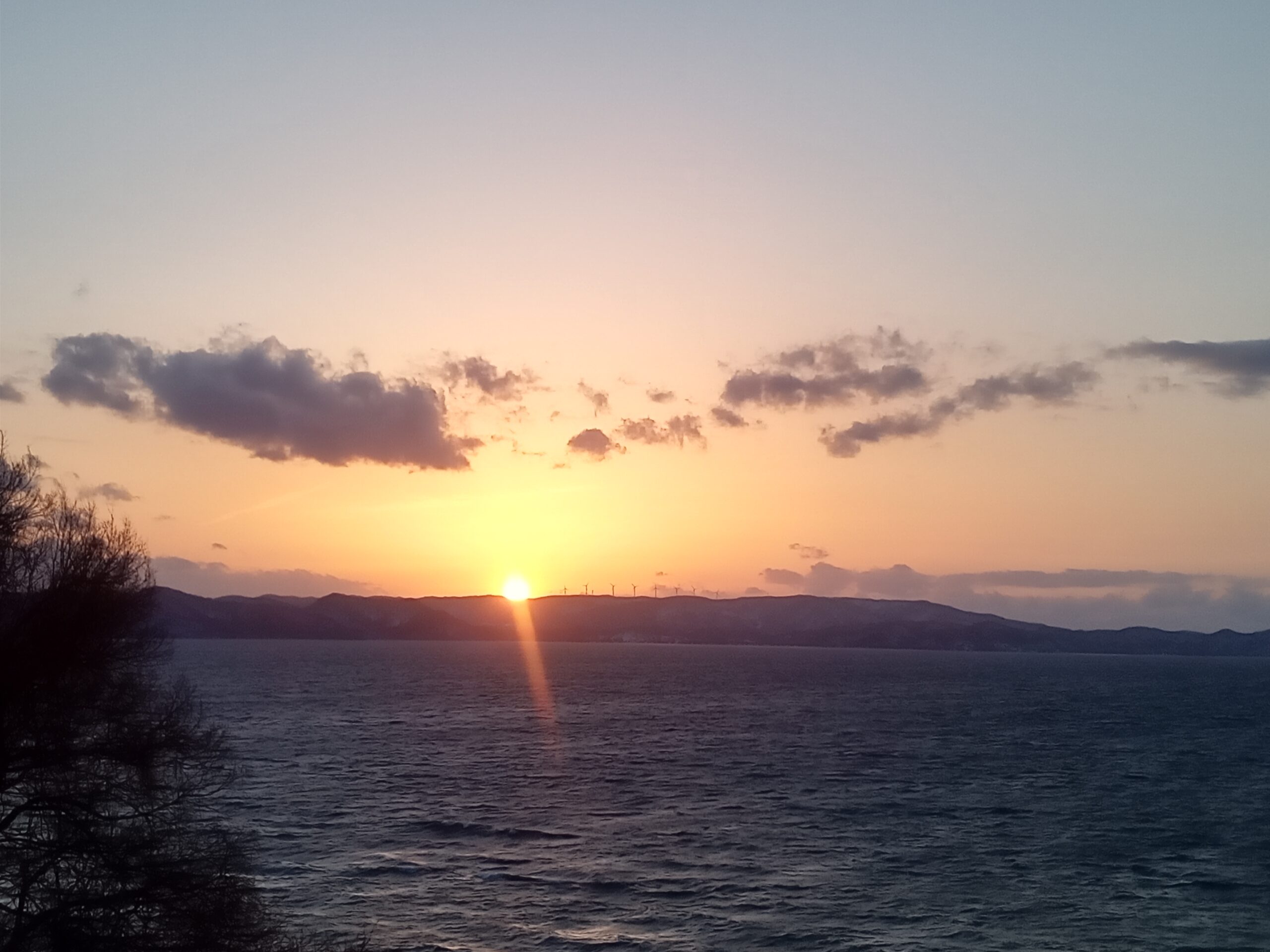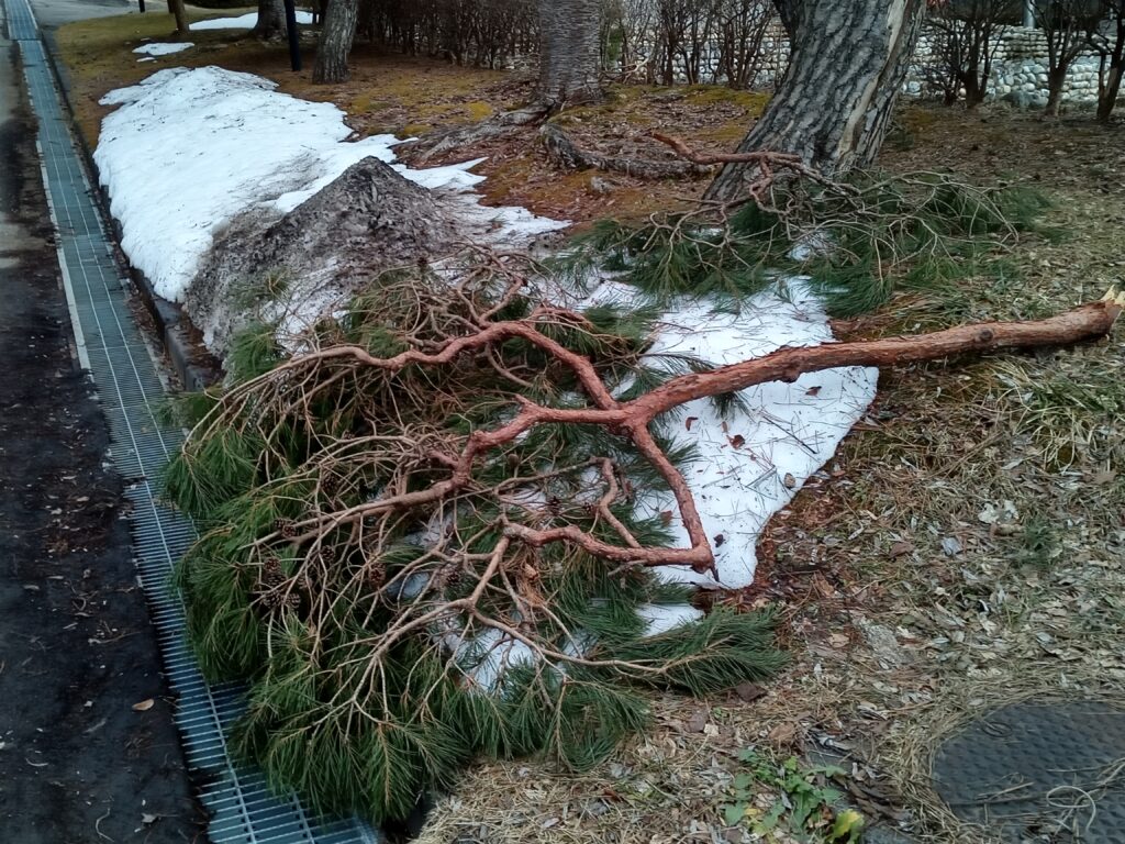 下の写真は、二月の大雪で枝が折れてしまったマンションの木々の姿(数か所あり)と、今日の駐車場の様子です。 周りの山肌にはまだ雪が残っています。 上の最初の写真は、昨日の夕方5時37分の夕日です。 一日中とても強い風が音を響かせて吹いていました。