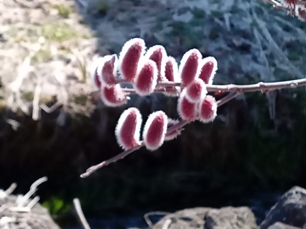 ゴミ置き場等で使用される網で、しっかりと包囲され鉄の柵に結ばれた「河童」(カッパ)のオブジェです。 よくよく見るとサングラスをかけているでは無いですか? 今までかけていた・・・? 疑問に思いつつ後にし、未だに花を見つける事は出来ません。 この周辺で一番早く咲く紅梅に期待しつつ、舟津のコミュニティーセンターを訪ねました。 蕾はだいぶ膨らんで来ましたが一輪も咲いていません。 此処の紅梅がまだ? 他の花は? まだ此の先! 諦め切れずに当然まだまだ先と分かっていたのですが舟津を後に、水中・水面に小さく白く梅の花に似た「梅花藻」で有名な中野を目指しました。 「梅花藻」は6月中旬からと分かっていますが、コンコンと湧き出し流れる清流小さな清水川、中を覗いても新芽の姿形もありません。 中野集落の中央を流れ、歩いても10分とかからない長さの川を、ゆっくり・ゆっくり右を見て左を見て、庭先でもいいから花が咲いていないかと進みました。 「梅花藻」の花が二番目に密集して咲く場所付近まで来た時に、太陽の光を浴びて輝いている「ネコヤナギ」が目に入りました。 猫のしっぽの様にふわふわと花が咲く事が名前の由来ですが、普段目にする色は灰色、でも目の前の色は濃いピンクです! 後から調べたら「ピンクネコヤナギ」と分かりました。 ほっとして色々な角度から写真を撮っていると、何と直ぐそば清流から20㎝程上の土手に、名前もめでたい「福寿草」が3個づつ寄せ合う様に二カ所、6輪咲いていました! 一年を通して一定の水温の湧水の影響が大きいのでしょうか? 嬉しい楽しい気分で帰って来る事が出来ました。 湖南より気温の高い街では、もう既に満開を向かえているかも知れませんが、例年に無く雪の多かった今年、花の訪れは少し遅れるかもしれませんが、桜特に山間の新緑の中に咲く山桜までの期間、沢山の花・野草を中心にお届け出来たら良いのですが、ちょっと少しだけ楽しみに待っていて下さいね! 一番最初上の写真は、18日夕方5時35分の夕日と、湖に反射する水光(光の道)です。 沈む位置が日ごとにマンション正面へと移動しています。 下の写真上段左側が、防風林の雪(氷)状態の白い帯です。 今日明日にも消えてしまいそうですが・・・。 中央が春を告げる黄色い花「福寿草」と、右側が名前の通り猫のしっぽの様な産毛が太陽の光に輝いて見えた「ピンクネコヤナギ」です。