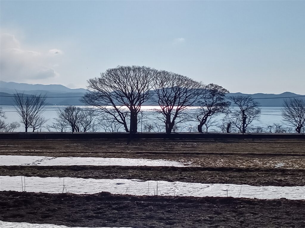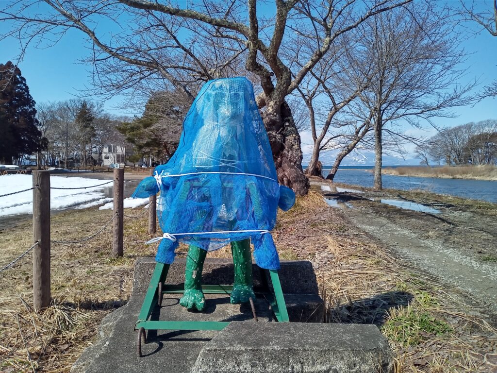 昨日18日(火)早朝は薄曇りで磐梯山を始め、湖周辺の山々は見えてはいましたが、少し靄がかかっていました。 11時を過ぎたころから雲が少なくなり、淡かった空がくっきりと青く広がり始めました。 風の弱さも後押し気温は6~7度でしたが、私にとっての春一番を見つけに、舟津方面月形地区へ出掛けて来ました。 例年ですと四月二十日ごろから咲き出す、桜並木が続く湖岸道路を進み、突き当りの舟津川を渡り湖南港へ。 途中雪解けの進む水田には、白鳥の姿と鳴き声も聞こえましたが、少し遠く写真に修める事は出来ませんでした。 後一ヵ月もしない内に北の空へと飛び去ってしまいます。 港から少し戻り舟津公園と舟津川河口を見て回ると、防風林の木が白い布を垂らした様に見え、近づいて見ると幹に固くなった雪が氷となり、張り付いています。 吹き荒れた雪の多かった事が伺います! そこから程近くに、青い雨具でも着せられたのかと思われるオブジェが置かれています。 何度かここを通り置物の姿を写真に撮った事もあり、それが何か分かってはいましたが、この青い雨具に見えていた正体・・?