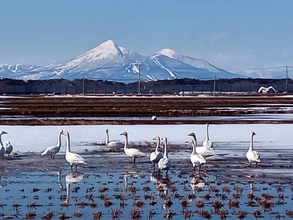 下段左側が青い網袋に包まれたオブジェ「河童」です。 拡大すると良く姿がはっきりし、サングラスが良く分かりますよ! カッパの左手雪が残る舟津公園の駐車場と、右手が舟津川の河口で、樹木の合間から遠くに磐梯山が見えます。 中央は中野からの帰り、舘と舟津の中間に広がる水田で羽を休める白鳥たちと、写真中央の黒く続く防風林の奥に湖があり、雄大な磐梯山の姿が良く見える場所です。 右側はマンションを浜路方面に曲がると、最初に広がる水田、町が小屋浜から太陽の光が湖に輝いている風景を撮りました。