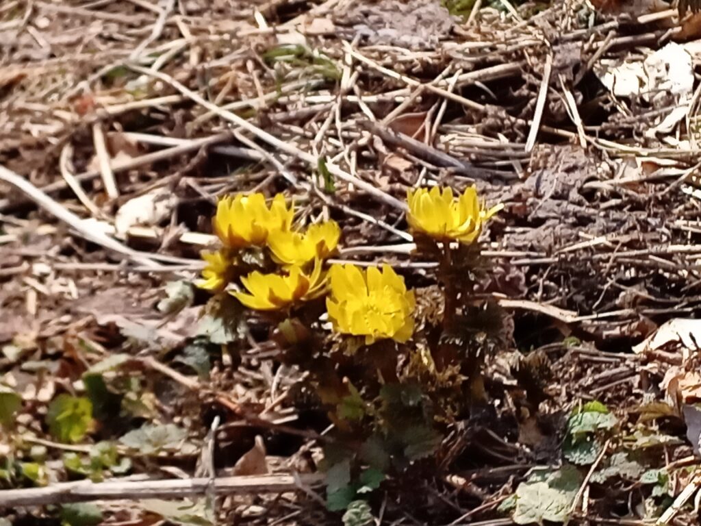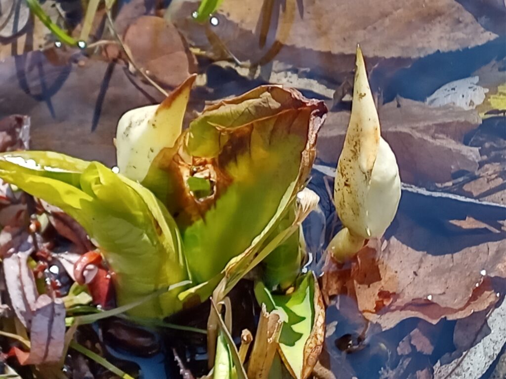中央が花の数が増えた「福寿草」、右側が高原を代表する春の花「水芭蕉」の一株です。