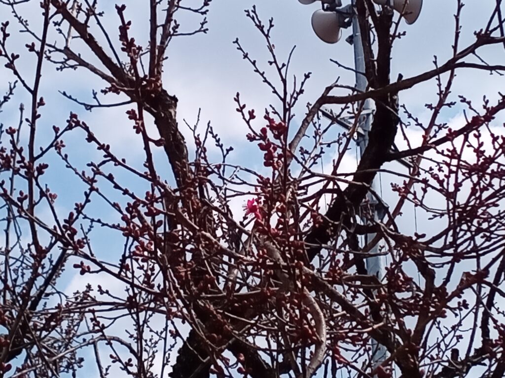 ホットしましたが、最初に目指した花は、この周辺で一番早く咲くはずと私が勝手に思い込んでいる舟津のコミュニティーセンターの「紅梅」です。 四日後の22日土曜日に、如何しても諦め切れずに出かけたのです。 建物の正面玄関前にある一本の梅の木。 日が陰って少し暗くなったこともあり、名前の如く濃いピンクの花が・・・見当たりません。 日が当たらず黒く空に向かって伸びた枝の群れだけが目に入って来ました。 何故まだなの? 歩み寄り木の真下まで行き見上げました。 蕾はだいぶ膨らみ今にも開きそうです。 青空が少し見え始め、太陽が顔を出し始めました。 そして・そして見つけました、