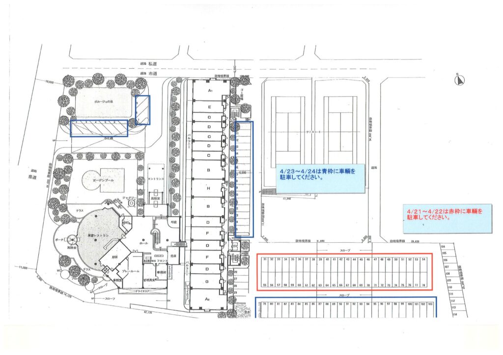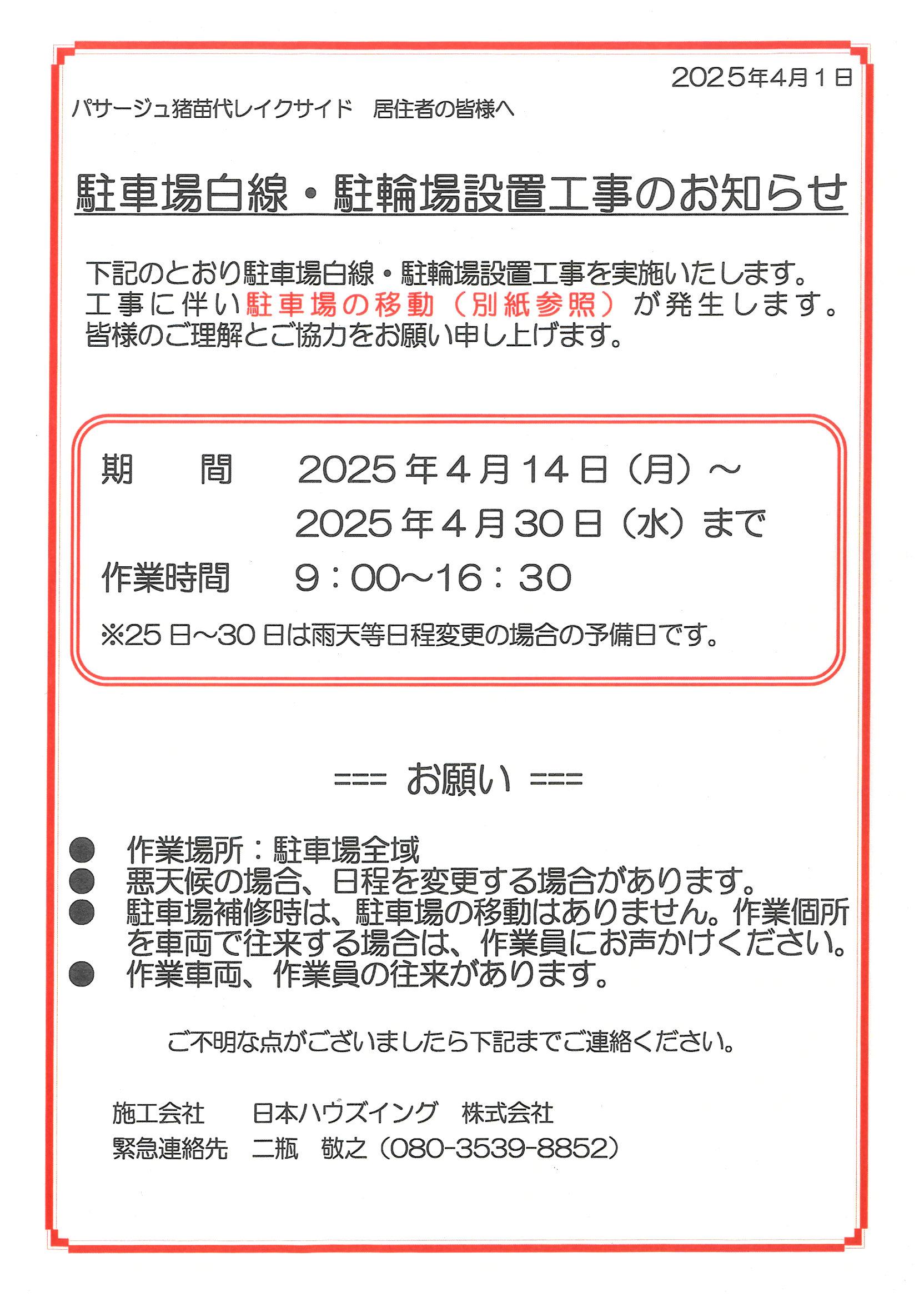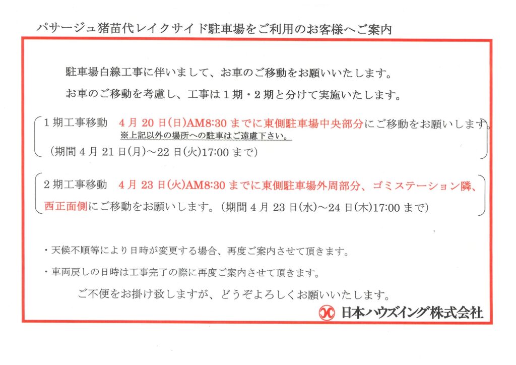 上のパンフレットで示した様に駐車場白線・駐輪場設置に於ける車移動のお知らせです!