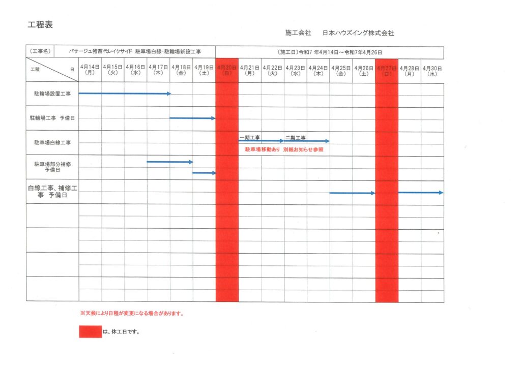 お知らせ上のパンフレットで示した様に駐車場白線・駐輪場設置に於ける車移動のお知らせです!
