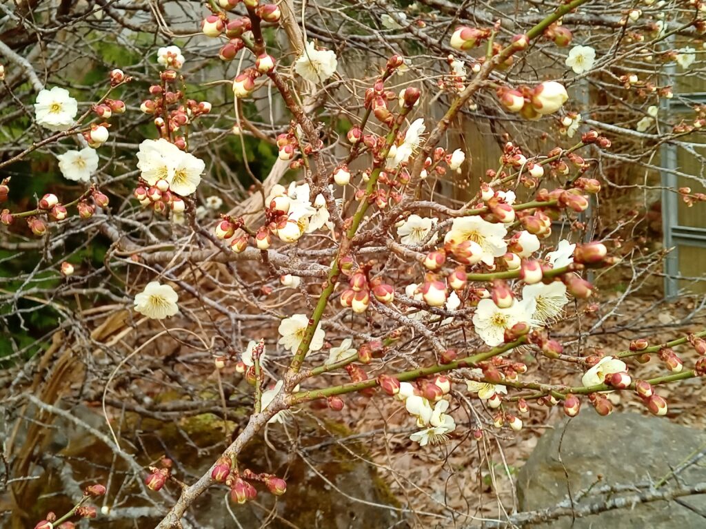 マンション裏の里山の木々の葉が少しですが、淡い黄緑色に染まり始め、新しい芽吹きが日毎に目に見える様になって来ました。 前回の日記では雑草と呼ばれ厄介ものと扱われてしまう、野の花を取り上げましたが、今日はその逆「まだ咲かないの?」「もう直ぐ咲くね」「やっと咲いたね」等など、心待ちにしていて春を告げる里山の花で、最も身近なものと、高原のイメージを持つ花の紹介です! 何れも歩いて5分とかからずに見る事の出来る花達です。 最初に一番近い所から、裏の駐車場出入口を出て直ぐに目に飛び込んでくる「梅」の花です。 先週から蕾がほころび始め、現在四分咲きでしょうか?