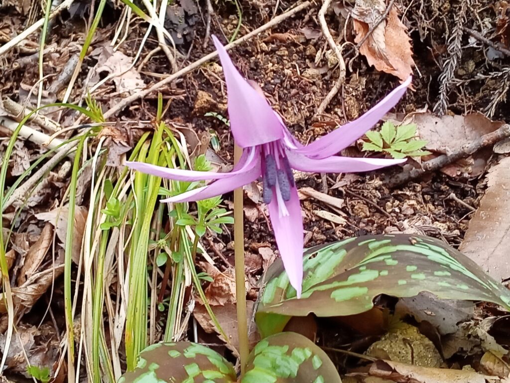 梅の木なんてあったかなぁ~?と思っている方もいるかも知れませんね。 今咲いています! 壊れかけたハウスの隣です。 木に至っては花が咲いている時には何の木か分かりますが、花が散り葉だけになると中々分かり辛いですが、今がチャンスです! 次は「キクザキイチゲ」の白い花です。 この花は3月29日の日記でも福寿草・マンサク等と一緒に紹介していますが、この時写真に撮ったのは浜路の集落の湖岸道路そばのものでしたが、今回の写真は県道9号線を右に曲がり、猪苗代町と郡山市の境の小さな沢のほとりに咲いている花の姿です。 色は数種あるのですが此処では白い花だけが咲いていました。 最後は「カタクリ」(片栗)の花です。 浜路ではキクザキイチゲと共演し、沢山咲き出していましたが、マンションから歩いて5分では行けませんよね。 ところが5分で行ける場所に咲いているのです! 先程のキクザキイチゲと同じ場所ですが、沢から少し林の中に入らなければなりません。 花の数はまだ少ないのですが、沢山の葉が出て来ていましたので、この二三日で数多くの花を見る事が出来ると思います。 涼しい場所を好み、落葉樹林の林床などに群生します。 春先に日当たりが良く、夏には木陰になるところに咲きますが、一枚の葉が出るのに7~8年もかかり、葉が二枚になって漸く花が咲きます。 咲いた後は地上部分は枯れてしまい、地下の球根が残ります。 和名の由来は花の傾いた様子や葉の形などと色々あるようですが、その一つに球根の形が栗の実に似ているからとも云われています。 そして何と云っても料理で使われている「片栗粉」は、この「カタクリ」の球根が原料でした。 明治時代以降、北海道で盛んに栽培され出した「ばれいしょ」に変わるまでの「でん粉」は全てカタクリの球根が使われていたのです。 集落の近くに雑木林が沢山有り、林の中に群れをなし咲いていて、でん粉が漢方薬としても扱われていたこともあり、里に近い場所からとられ、雑木林と共に姿を消してしまいました。 時の流れが名前に残されているのです。 現在のでん粉は「じゃが芋」ですので漢方薬にはなりませんのでご注意下さい。 「カタクリ」の花が大好きな事もあり、長々と書いてしまいましたが・・・赤紫の花びらを下向きに大きく広げながら咲く姿は、早春の山を彩る可愛い花です。 マンションから一番近い場所は荒れた下枝が絡み合う林の中ですので、行かれる方は足元や服装を整えて、充分に気を付けて下さいね! 一番上の写真は昨日の午前中、弱い雨が降り続く中で、廊下から撮った裏の林です。 まだ僅かですが淡い黄緑の葉が姿を見せて来ました。 下の写真は上の文章の順番で、左から「梅」「キクザキイチゲ」「カタクリ」の花です。