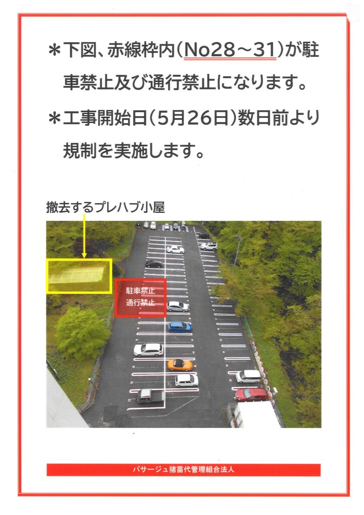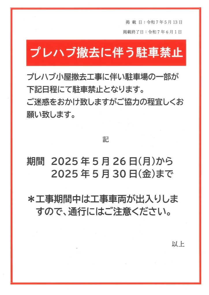 お知らせ長年放置されていたプレハブを撤去致します。 駐車場を使用しての作業に入りますので、車をお持ちの方は駐車位置に充分にご注意ください! 日程や駐車禁止場所は下のパンフレットをご覧下さい!