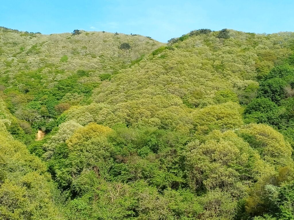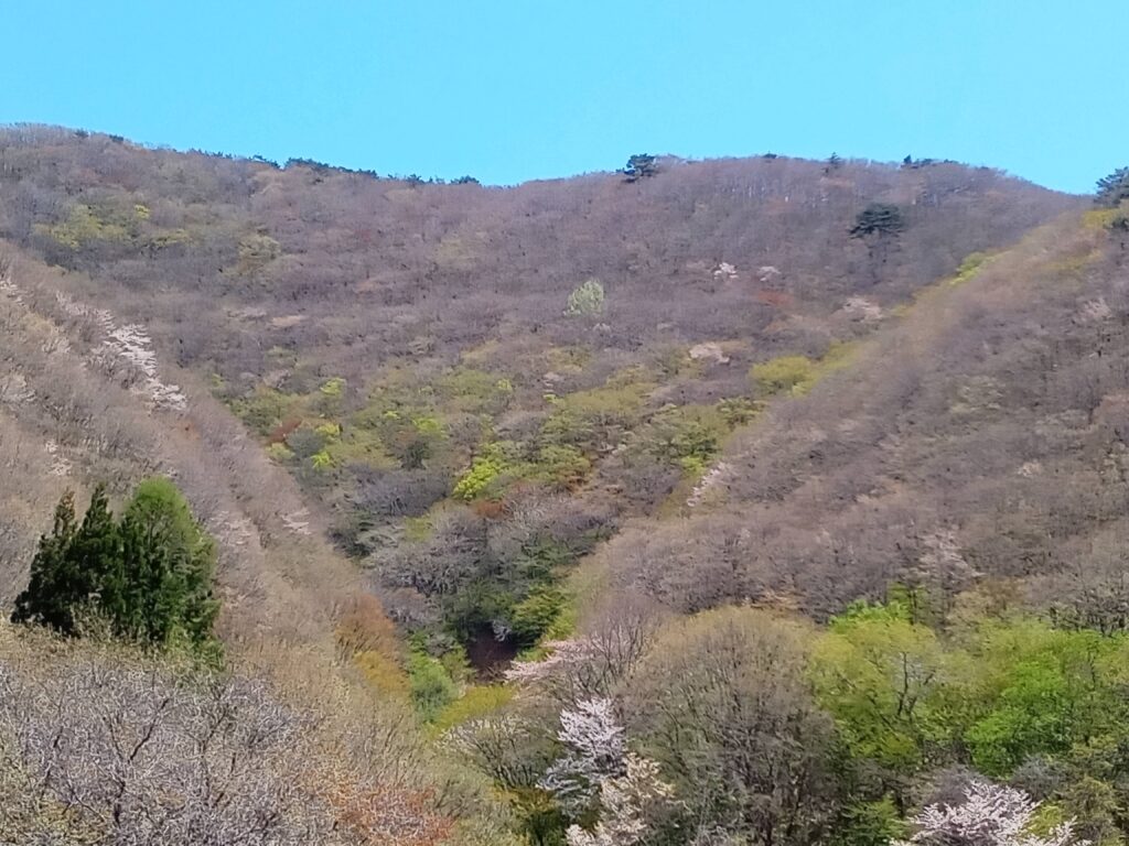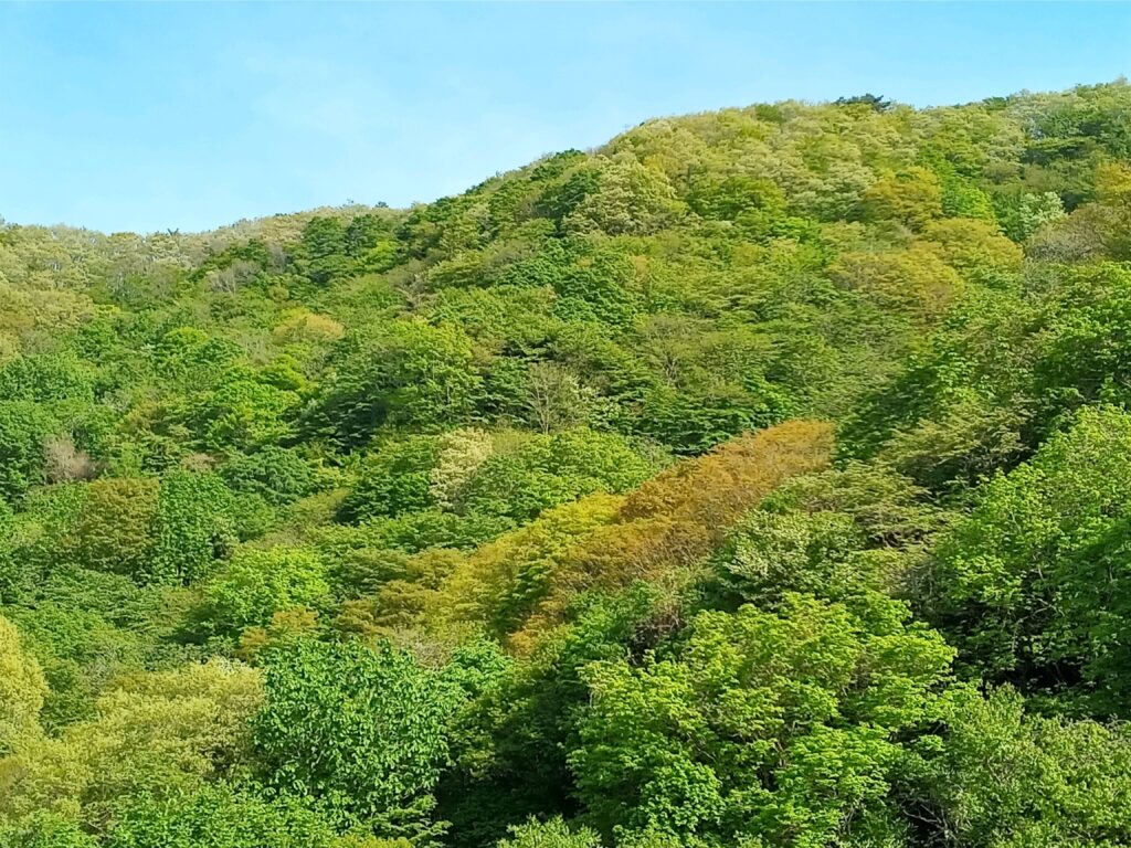 風薫る五月も、もう中旬。 芽吹いたばかりの「萌黄色」(もえぎいろ)から始まった緑の葉は、日毎に濃くなり「新緑」「若葉」と過ぎて「青葉」へと変化を遂げています。 四月梅や桜の開花で、待ち焦がれていた春が訪れ、花の後を追うように木々に沢山の緑が生まれました。 五月の美しさは花もさることながら、やはり言葉では表現出来ない程の緑では無いでしょうか?! 一緒くたにしてしまう緑ですが、伝統色として「84色」もあり、それ以上と云われています。 緑と云って思い浮かぶのは、やはり植物でしょうか? これ以外で思いつくのは・・・。 日本で「みどり」と言う言葉が登場したのは平安時代に入ってからで、そもそも色を示す言葉では無く、本来、瑞々(みずみず)しさ、新鮮で生き生きしている様子や、若々しい様子を表す意味だったとの事です。 それが転じて植物の新芽や枝を指す様になりました。 黒く艶のある女性の美しい髪の事を「みどりの黒髪」と呼ぶのは、此処から来ている様です。 自然界の中で余りにも身近にある色で、今まで考えもしませんでしたが、此の地で数年過ごし、裏山の緑の葉の成長を間近にして、改めてその深さを心身の安らぐ色として、認識しています。 色々並べる言葉より、是非この地を訪れて頂いて、目も耳も五感全てが楽しくなる事を味わって下さいね! 下の写真は廊下から見た裏の里山の風景です! 五月初めにも同じ場所を載せていますが、比較して頂けるように、上段が3日で下段が今日16日の風景です。 同じようにどちらの日も青空でした。 日当たりの具合で、北側の斜面と南側では葉の成長がだいぶ違いますね。 左側が廊下より向かって北、右側が南です。 先週の終わりから週初めは、とても風が強く花びらの小さな白い山桜は散ってしまいました。 そして今週昨日から風がおさまり安心していましたが、気温がぐんぐんと上がり、今日は25度ちかく夏日になるの・・・?と、一気に暦の上では無く、暑い夏が直ぐそこまで来ている様です。 増々緑が濃くなり、やわらかな色が恋しくなりそうです。