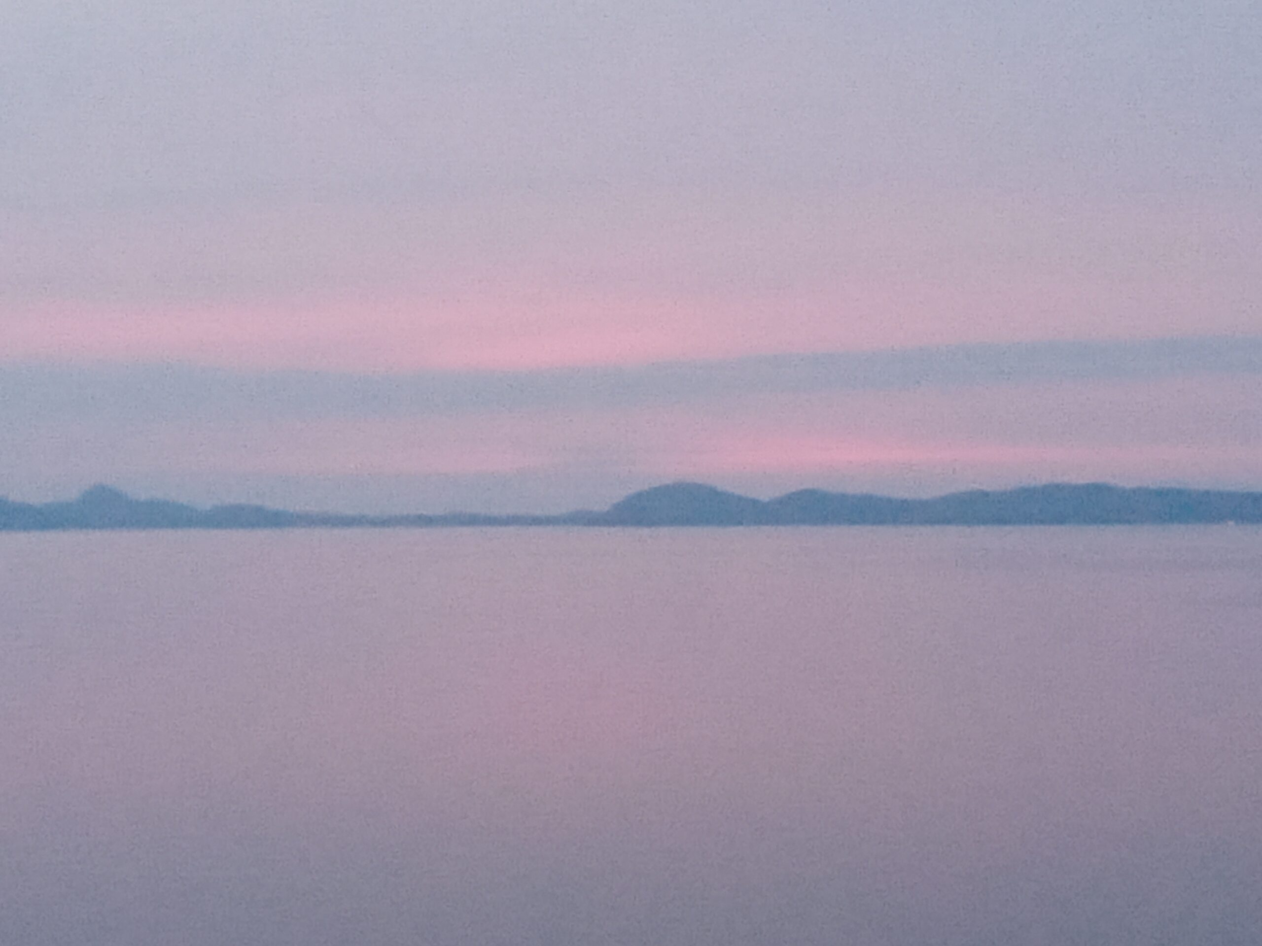 上の最初の写真は、昨日夕日は見れませんでしたが、午後6時50分ごろから空全体が淡いピンク色に染まり出し、風も穏やかで湖も静かで空の色を映し出した、午後6時55分の対岸の景色です。