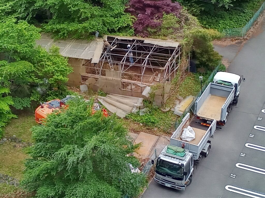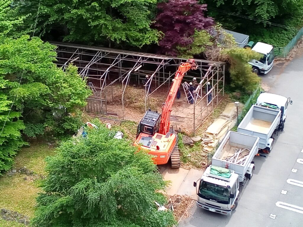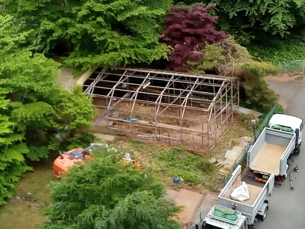 先月5月26日(月)から30日(金)まで、「プレハブ撤去」が行われ、現在はその跡地を駐車場にするために造成工事が進められています。 今日はその工事の進み具合を写真で追って見ました。 中々工事現場を通る事はあっても、その作業の流れを間近にする事はありません。 いい機会を得ましたので数回に分けてお届け仕様と思います。 第一回目の今日は、長年放置されていた「プレハブ撤去」の様子です。 5月24日(土)、26日からの工事に備え「解体重機」が準備されました。 鉄骨は使われず鉄筋だけのハウスで、切断用に使用される鉄骨カッターでは無く、ハウスを壊したり物を掴んだりと云った、色々な動作を行う重機です。 人の手によってハウスを囲んでいた木々の枝が払われ、屋根が取り外され重機の出番です。 見る見るうちに切り刻まれ、その種類別に車に積まれて行きました。 下の写真はその流れで、最初の3枚が26日の作業と、その下の3枚が27日の作業風景です。 26日左側が何年放置されていたのだろうか? 小屋は濃い緑になった「楓」や「梅」「欅」の枝や、蔓に覆われています。 赤紫に見える葉は一年中紅葉している様に見える「野村楓」(ノムラカエデ)です。 中央の写真は屋根が取り外されて行く中、種類別に廃棄される為の車2台が待機中。 右側が作業が進み、此れから重機を使用して廃棄物を車に乗せる準備中です。