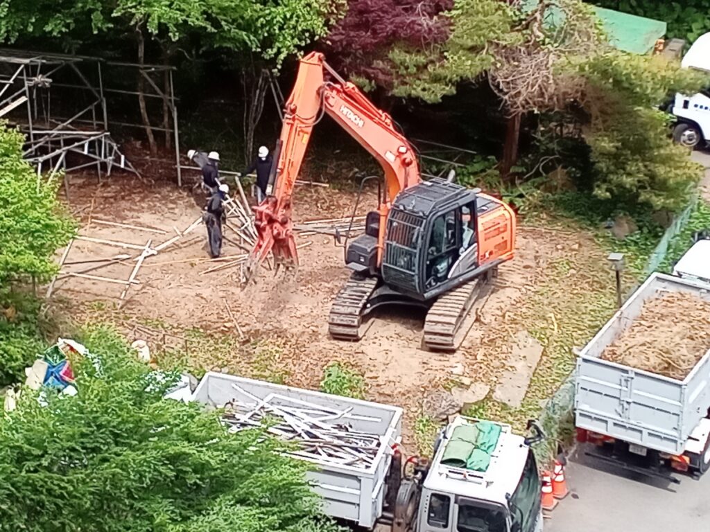 更に翌日27日の写真。 左と中央が鉄筋だけになった骨組みをつまみ倒す重機の作業様子です。 右側は後片付けも終わり、土台だけとなり小屋に隠れて見えなかった幹が、木々達の枝と葉だけでは無く姿を見る事が出来ました。 今回はプレハブ撤去を載せましたが、次回2回目は6月を迎え、緑が深くなりましたが、駐車場にするためにどうしても必要な作業、木々達の伐採作業の様子をお伝え仕様と思っています。 上の最初の写真は、作業が進む隣のテニスコート入口で咲く、「ヤマボウシ」の花で、下地の赤い色はテニスコートふちのコンクリートの色です。
