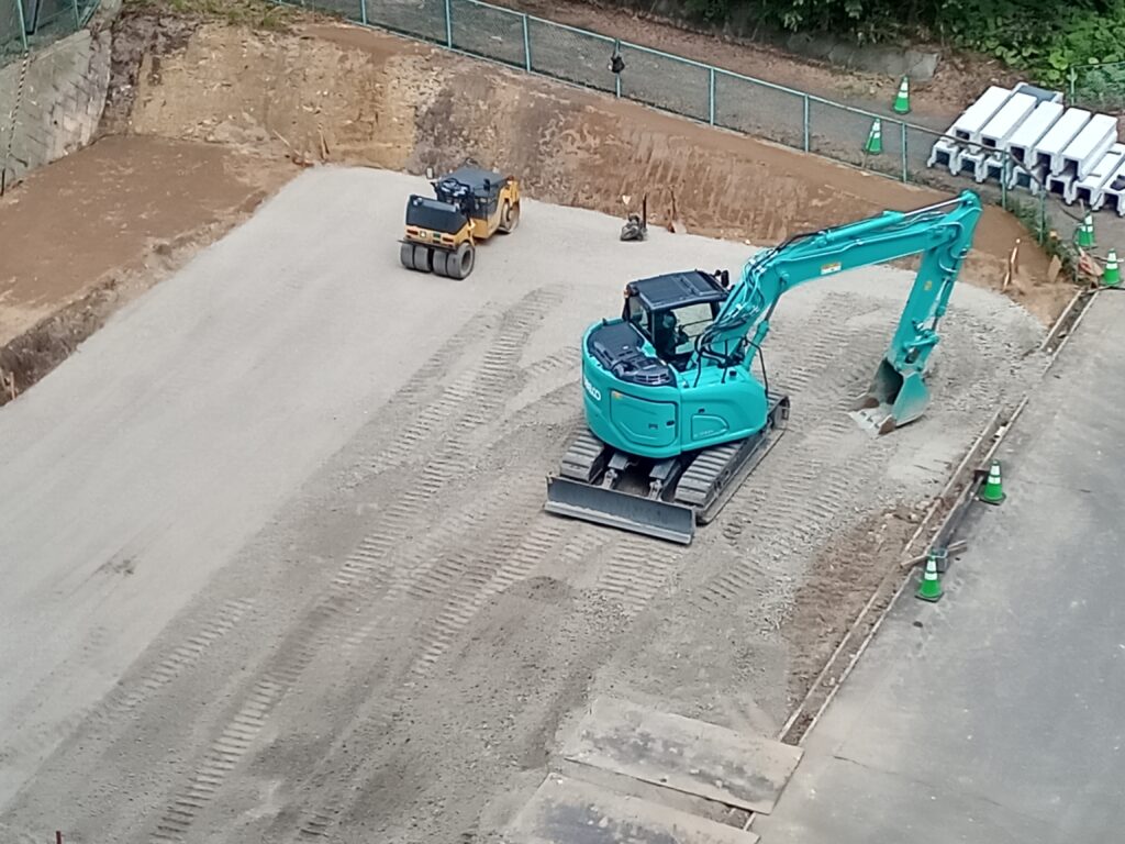 2回にわたり工事の写真を載せてきましたが、3回目の今日は、木々達が切られ空き地となった状態から、アスファルトが敷かれ、線引きが行われ完成した様子を、少ないですが6枚の写真でお届け致します。 一番目左側が下地工事と呼ばれている作業で、既存の路面を掘削し、地盤を転圧して安定させています。 青緑の重機が掘削する「ブルドーザー」。 小さな重機が転圧する「ロードローラー」です。 中央の写真は、排水溝作業でコンクリートの樋が並べられて出番を待っています。 重いものを持ち上げるのに、ここでも「ブルドーザー」が活躍します。 右側が下地工事が終えた路盤に、アスファルトを吹き付ける舗装材料敷き均しをしているところです。