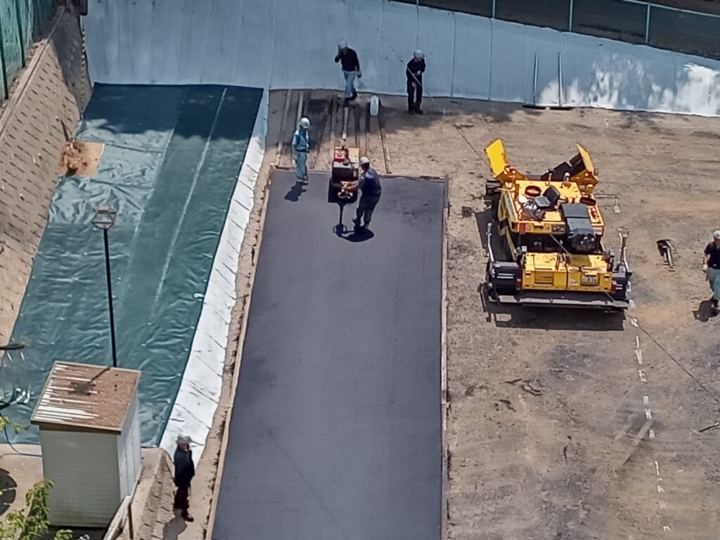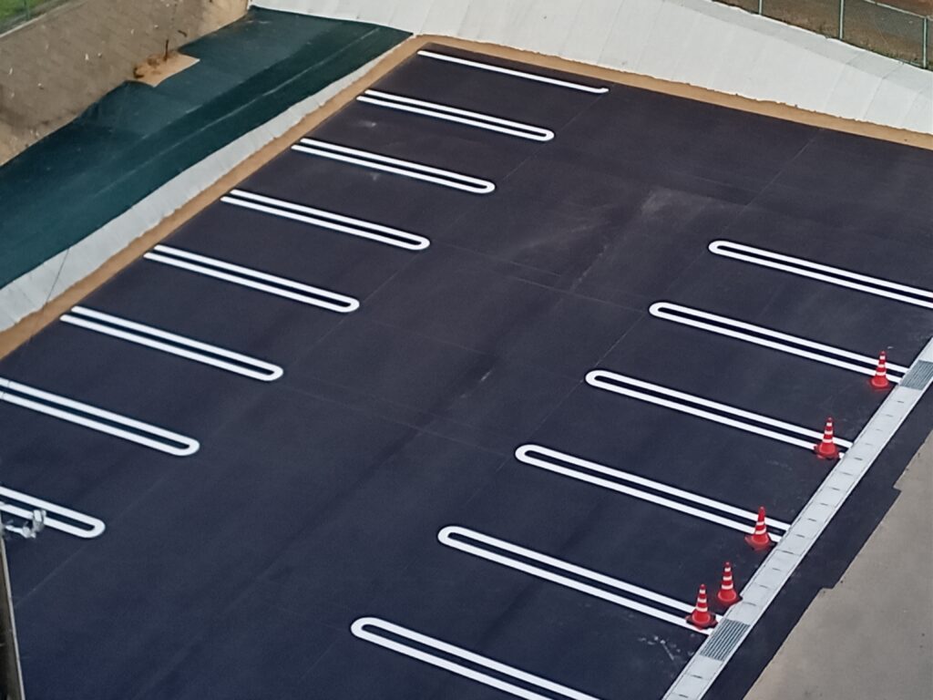 下の写真左側が、舗装材料を締固め密度を高め強度を上げる作業です。 中央が表面が滑らかに仕上がり、最後の作業のラインの下書きです。 右側がラインがくっきりと引かれ、駐車場の形が出来上がりました。 この写真の作業に入る前にも沢山の行程がありました。 側面の処理や照明配線など・・・。
