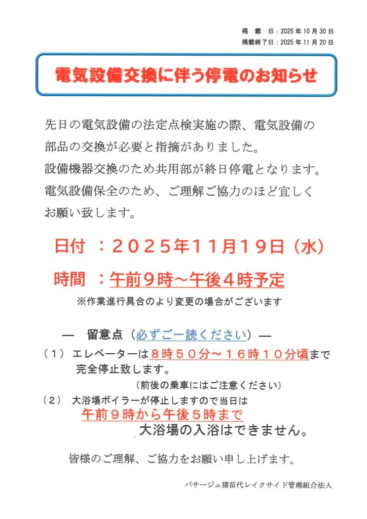 年に何回か電気設備に伴う停電がありますが、殆どが午前中で、長くて三時間程度です。