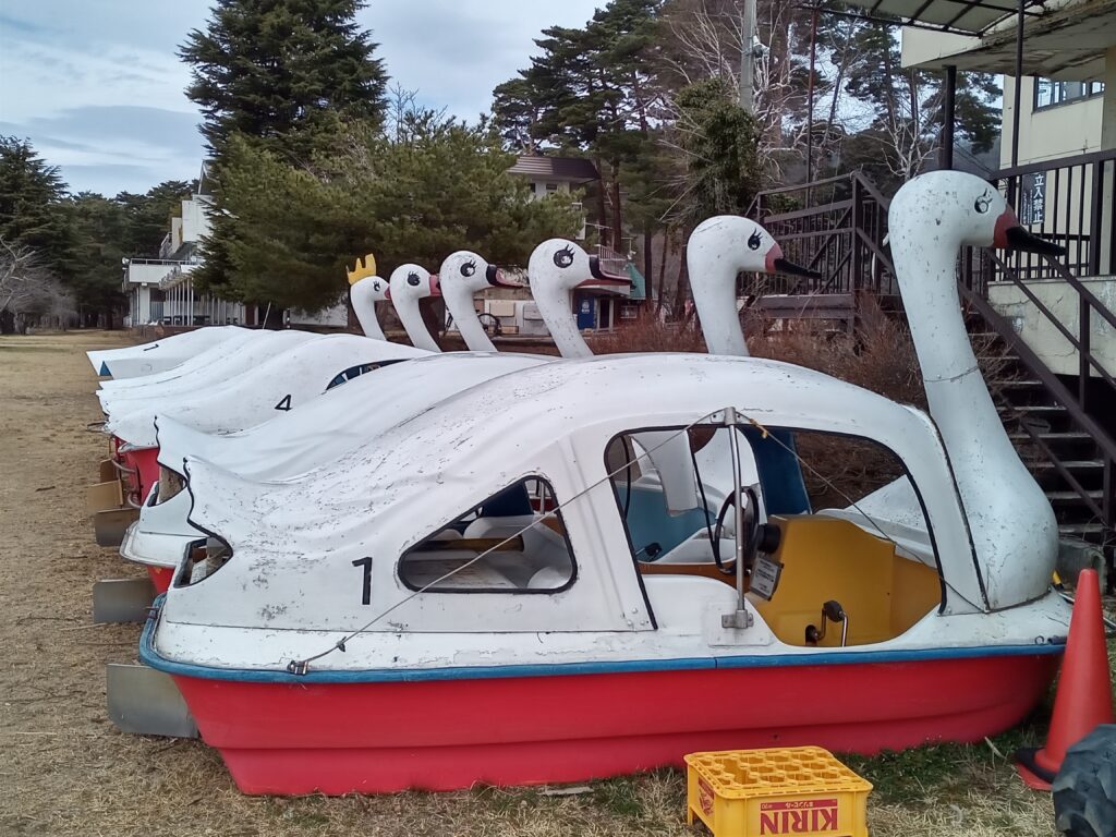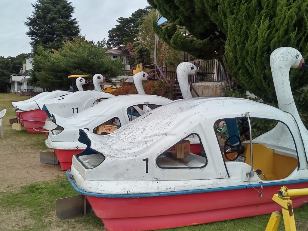 二つ目の出来事は、マンションから程近い猪苗代町志田浜の白鳥たち。 ロシアから約4000キロ、冬の使者「白鳥」。 今年の飛来は昨年より3日早く10月9日でしたが、例年の第一陣は10羽程度ですが、今年は52羽(コハクチョウ)で大変多くニュースにもなりました。 来年1月頃にかけて2500羽を超える数が訪れますが・・・本当の白鳥ではなく、ボートの白鳥たちの話です。 頭に冠を付けた王子とそれを囲む5羽。 シーズン初めは6羽だったのが、シーズン終わりの9月下旬には5羽になり、寂しく陸に上げられ浜の方にお尻を向けて並んでいる姿が何とも言えません。 熱い今年の夏、涼しさを求めて訪れた観光客を乗せて楽しませていたはずが、悲しい事に1羽だけ壊れてしまったようです。 今年の役目を終えて来年までの眠りについたようです。 一つ目の「梅花藻」は自然の出来事。 二つ目の「白鳥のボート」は創られた物の何時かは壊れる運命。 どちらももう少し頻繁に写真を撮っていたら、その過程を見る事が出来たのにと、残念で心残りの日々でした。 下の写真2枚はシーズン初めの6羽と右端がシーズン終わりの5羽で冠の王子は健在です。