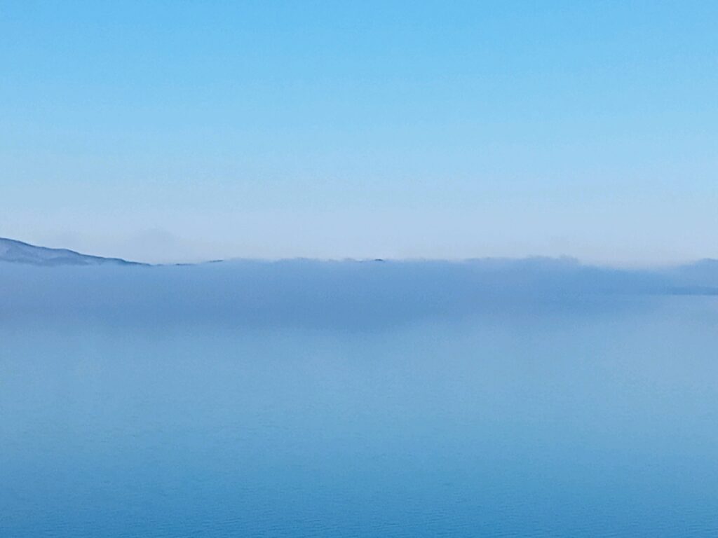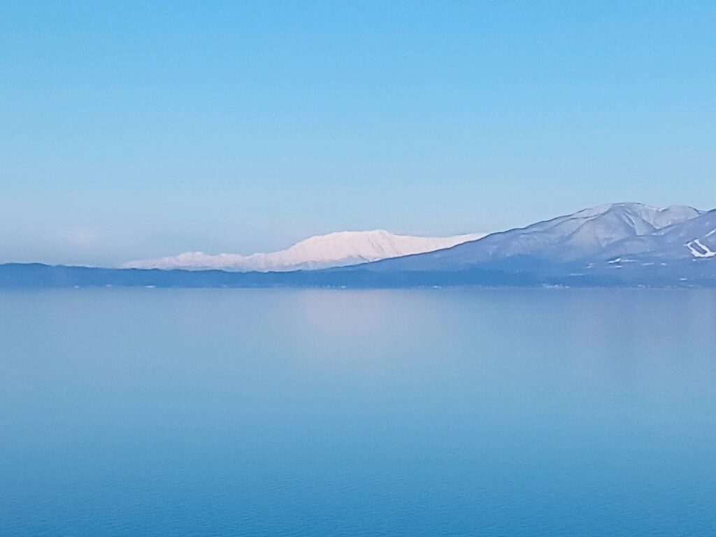 上の写真はお昼過ぎの磐梯山。 下の写真は午前10時半、左が正面で湖からの靄で里山が見えません。 中央が真白な飯豊山、右が会津を代表する磐梯山。 マンションベランダからの風景です。