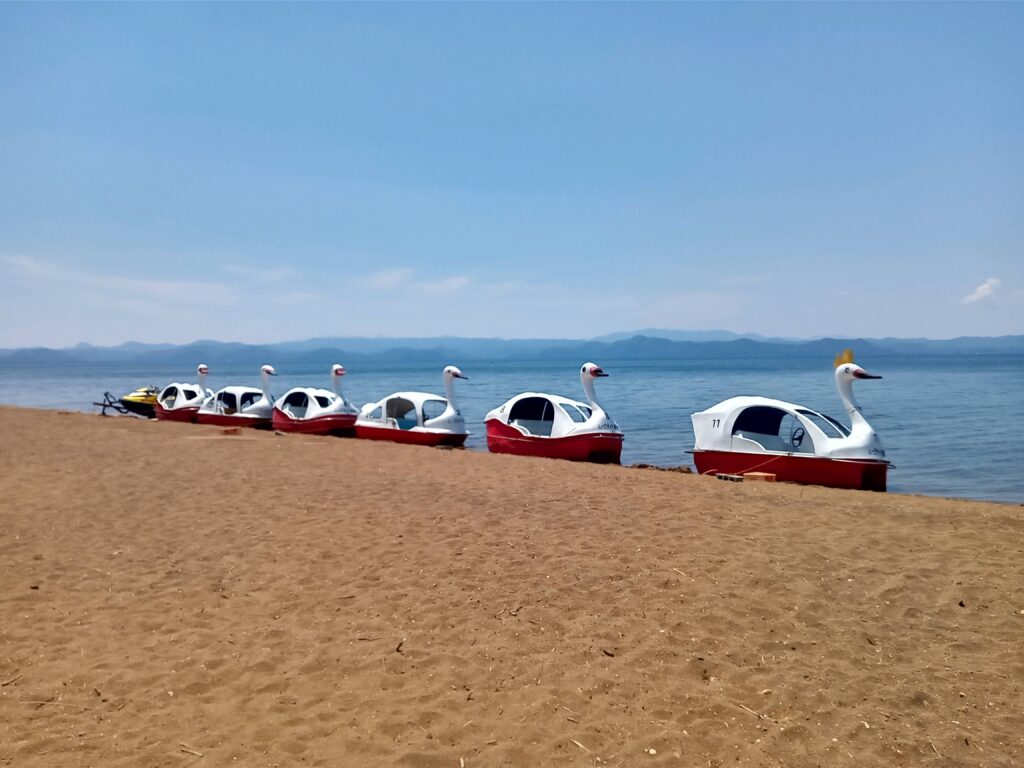「白鳥ボート」は一度も活躍する事無く、王子を囲んで砂浜に並んでいた。