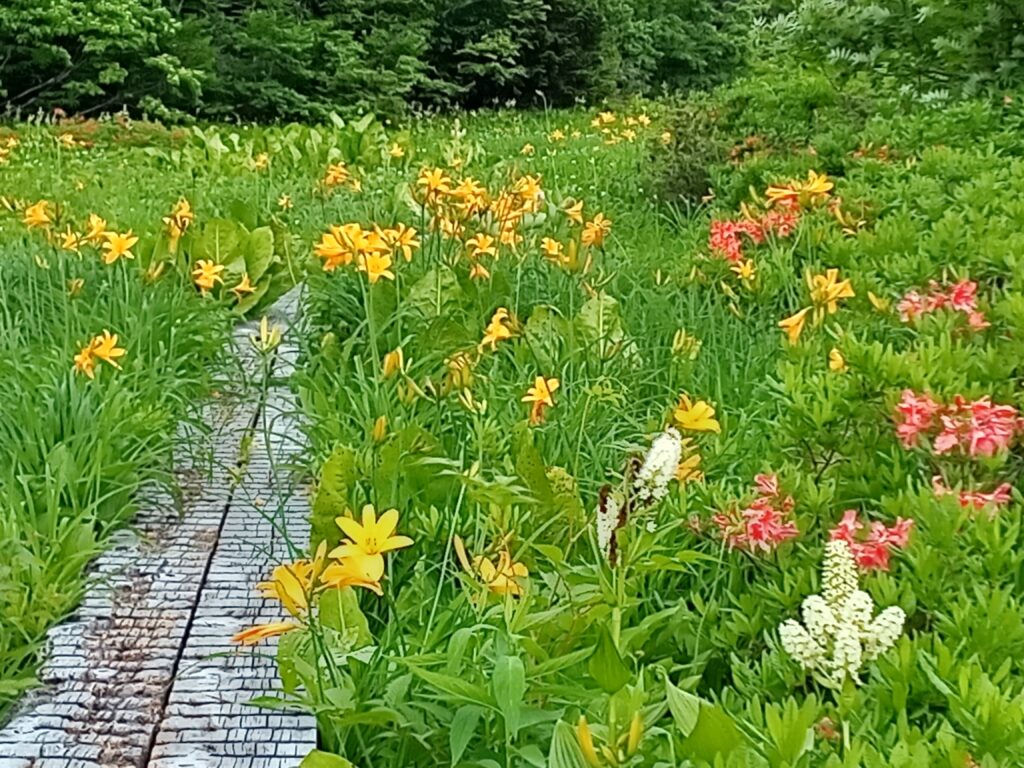 花です。 左から「ミヤマダイコンソウ」「ニッコウキスゲとレンゲツツジ」白い花「サンカヨウ」
