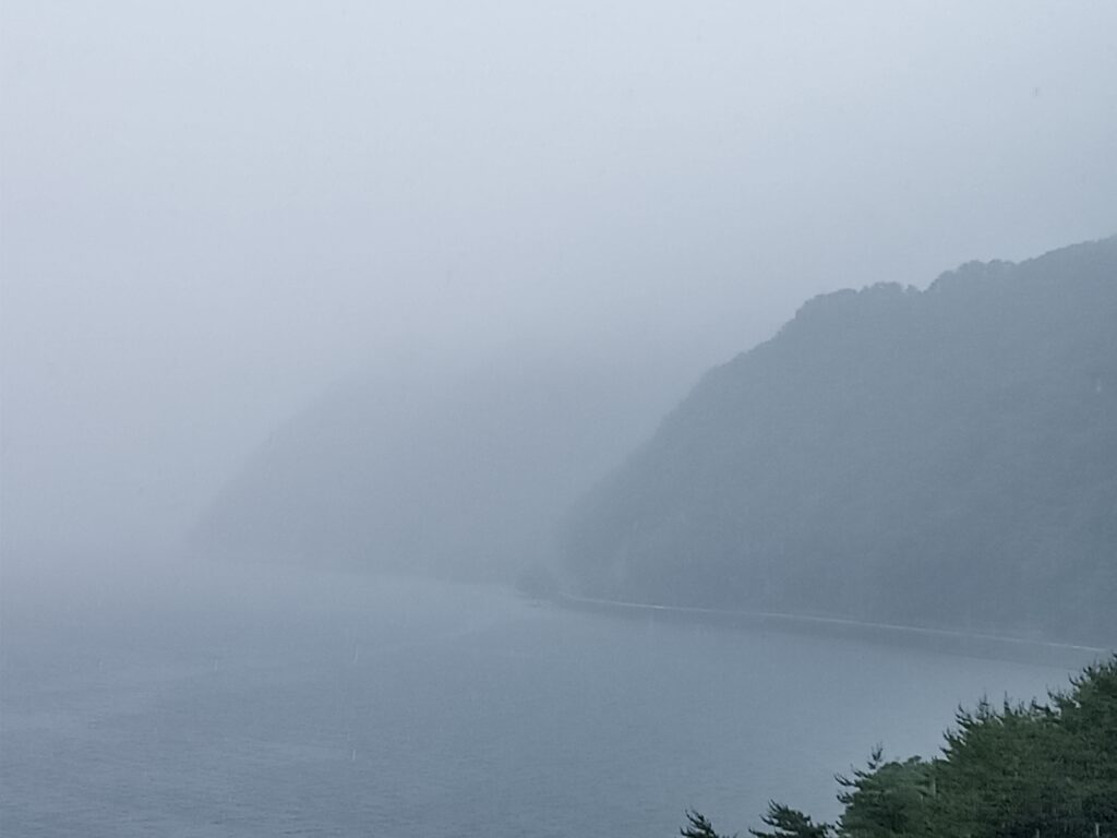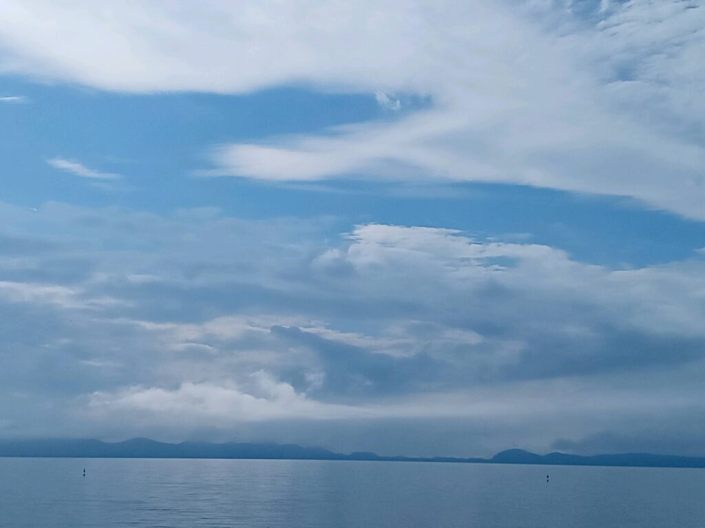 早朝六時ごろは、僅かながら青空も見え磐梯山も見えていましたが、午前10時半ごろから白い世界に変わり、雨脚も強くなって来ました。 但し風は弱く白波が立つ事はなかったです。 天気予報通り湖南は午後一時過ぎには雨は上がり、灰色の雲は多いなか、隙間から青空が覗き始めました。 隣町猪苗代方面は重い雲に覆われたままで夕方を向かえてしまいました。 最初の写真は雨上がりの湖南上空に広がった青空です。 下の左端は午前6時15分ごろと、雨が降り出した午前11時前、湖上に青空が広がった午後4時ごろの写真です。