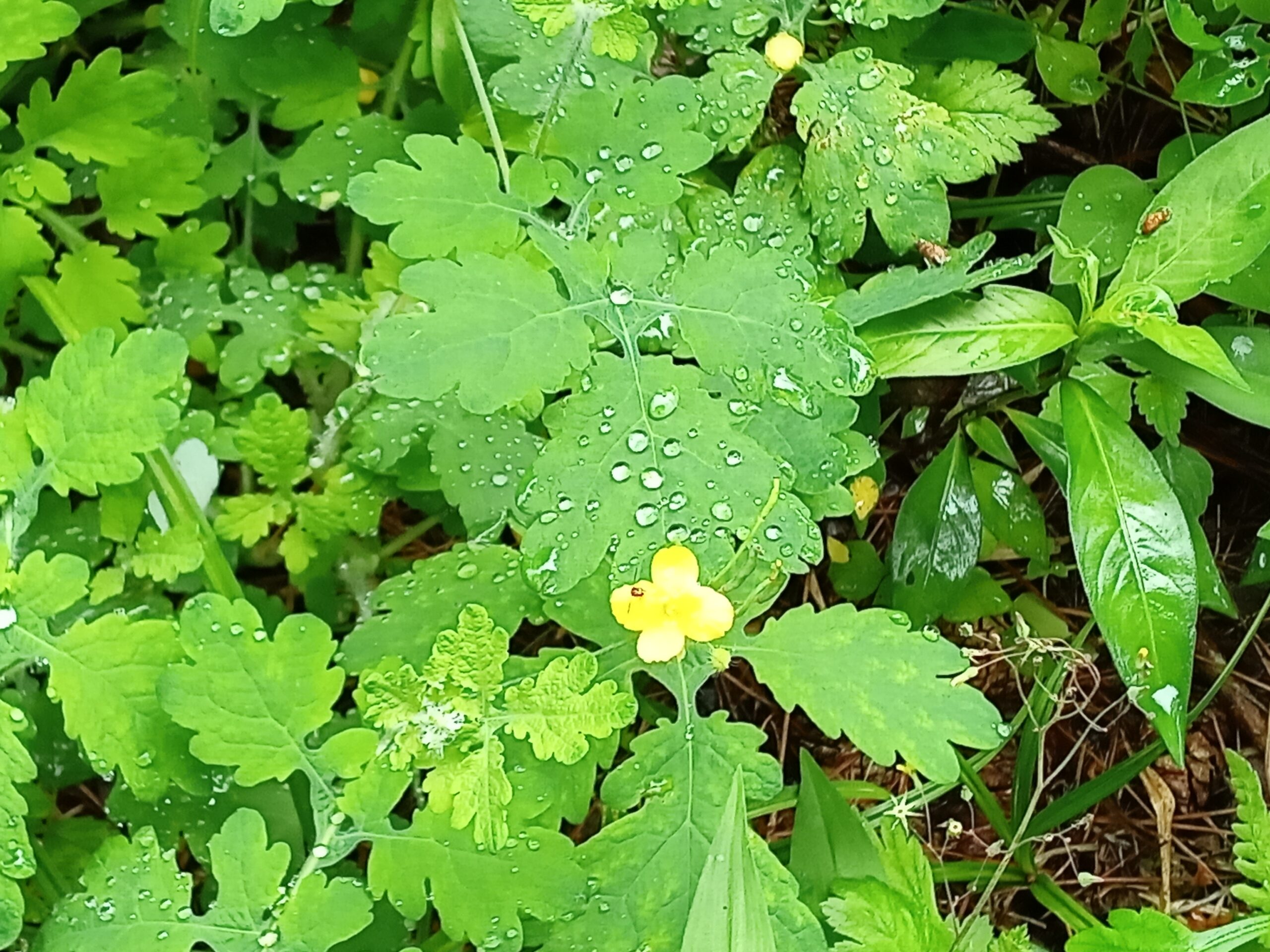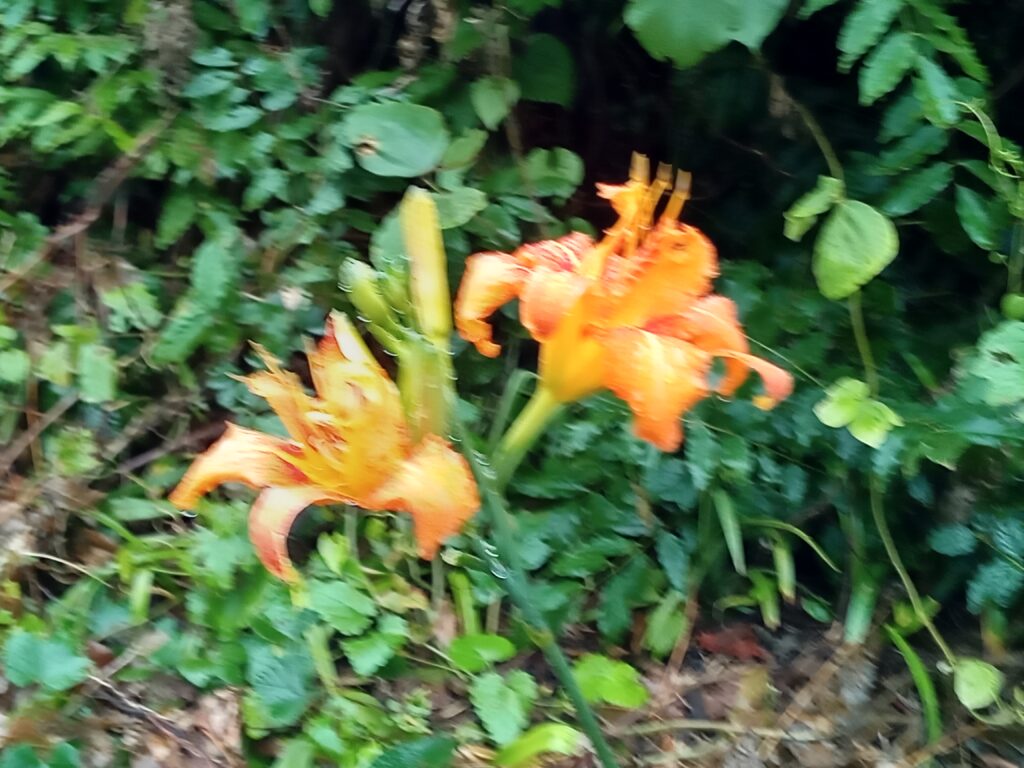 夏の花「ヤブカンゾウ」で八重咲きで橙色と右端が時に20数個程の白い花を横向きに咲かせる「山ユリ」です。 最初の写真は、雨上がり葉に雨水が玉の様に溜まり、キラキラと光る様子が綺麗で撮った一枚です。 「水玉を置く」と言う表現があるそうです。