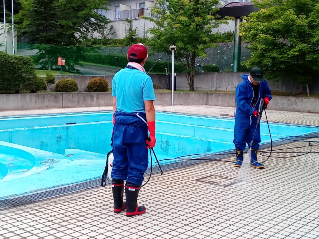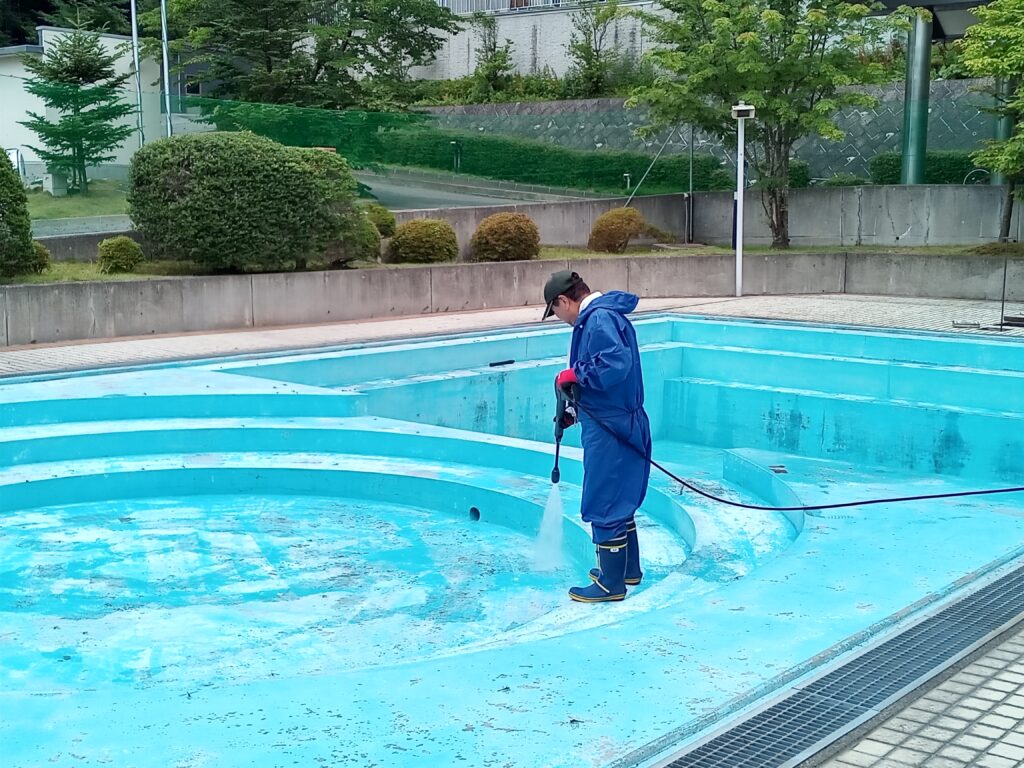 お知らせ只今、20日のオープンに向けてプールの掃除が行われています。 12日(金)に水抜きをし、13日(土)プールサイドの掃除、14日(日)の今日はプール内の掃除と水入れ、明日15日(月)はプールに水を張る。 これら掃除作業の流れを終えると、雑菌作業や水質検査などを経て、オープンとなります。